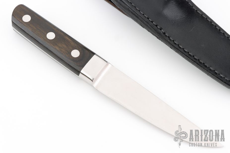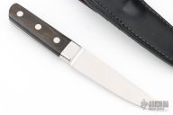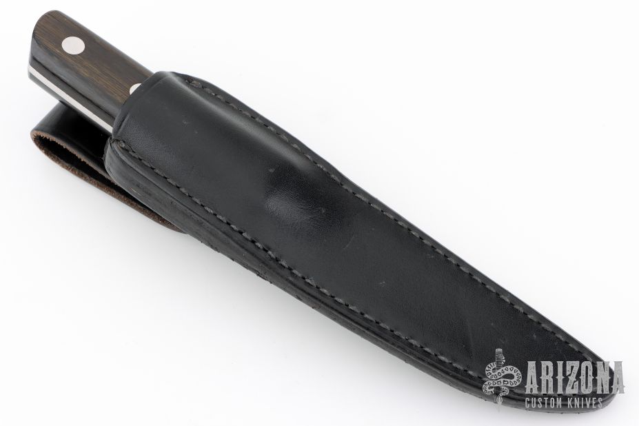 This is a vintage Al Mar Model 4003 has laminated wood scales, integral bolster and full tang construction. Satin finished blade with .126" blade stock and 1.126" blade depth. Comes with black leather sheath. Excellent condition.