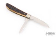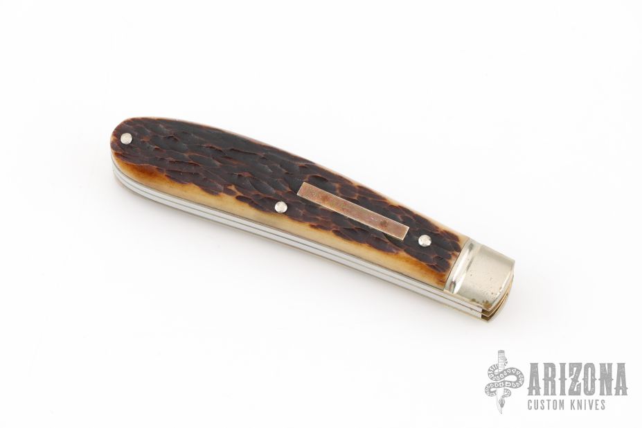 This Swayback from Takeshi Matsusaki features two hand rub satin finished blades with nail nicks. The handle has pinched and fluted nickel silver bolsters, stag covers, stainless springs and brass liners. Half stop on blades. Great blade seating. Comes with zipper case. Has some light scratches, otherwise excellent condition.
