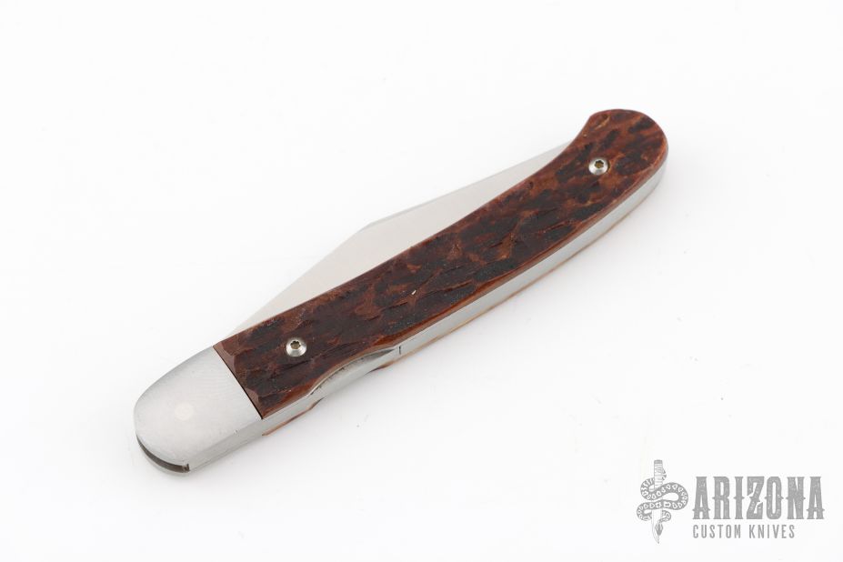 This Mid-Lock by Master Smith PJ Tomes features a hand rub satin finished blade with nail nick. The handle has stainless steel bolsters and stag jigged bone covers, stainless steel liners and backspacer. Comes with a leather slip sheath. Has a couple light scuffs, otherwise Excellent condition.