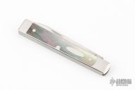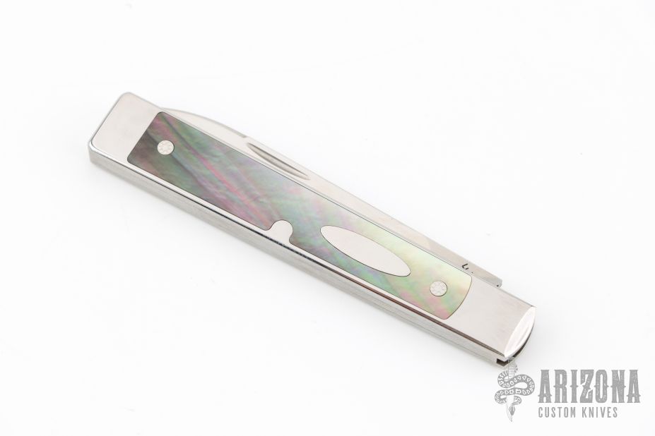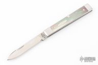 This Interframe Doctor's Knife Mike Alsdorf features a mirror finished drop point blade with swedge and nail nick. The handle has mirror polished stainless steel covers with pearl inlays stainless steel spring. Comes in a zipper case. Has a couple light scratches, otherwise Excellent condition. Dated 2008.
