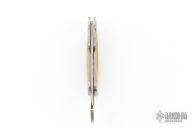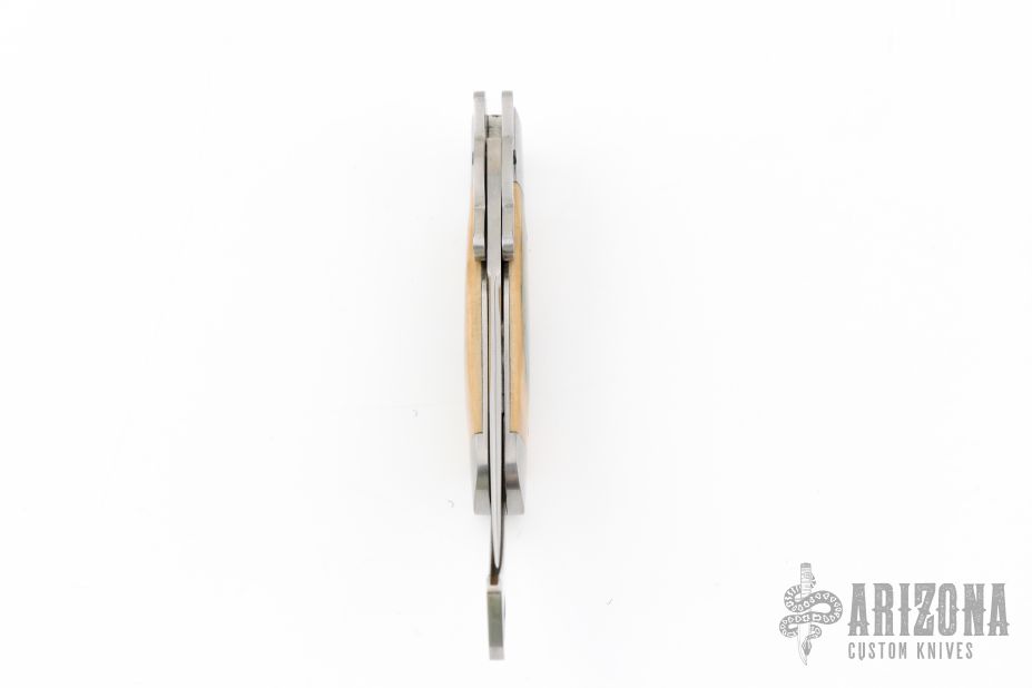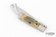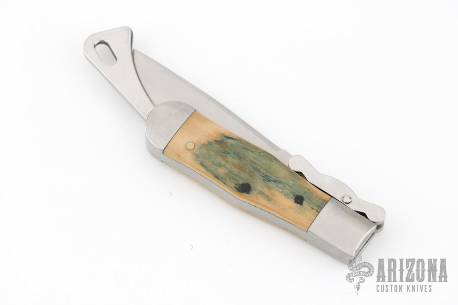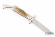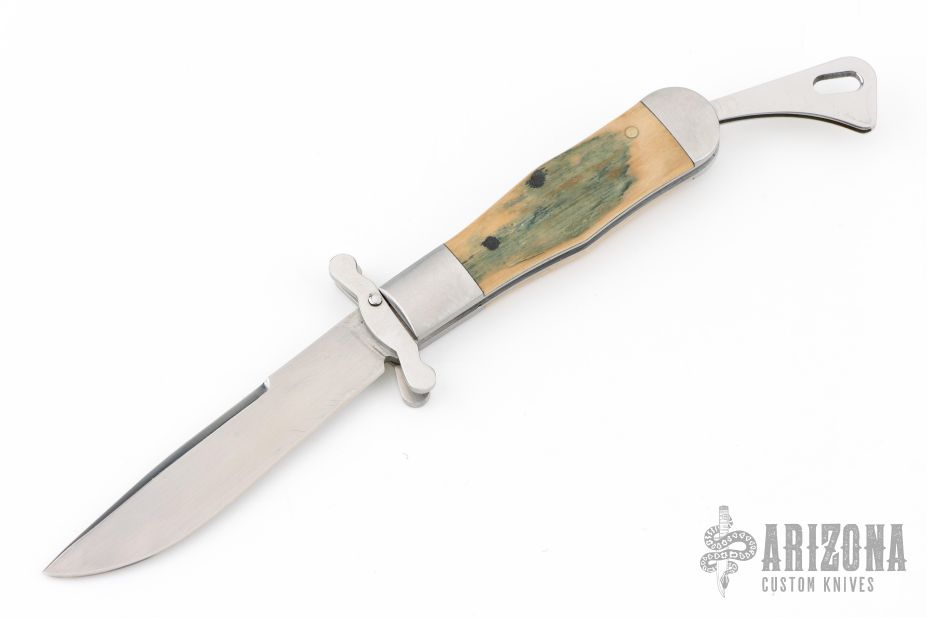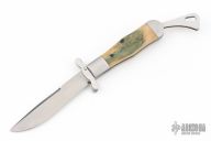 The unique design of the Marbles Safety knife makes this an intriguing piece by Amherst Cutlery. It has a hand rub satin finished blade, steel swing guard and bolsters, steel liners and steel spring and blade cover. Has scratches, and heavy scratches on the b-side of the blade. Good condition otherwise.