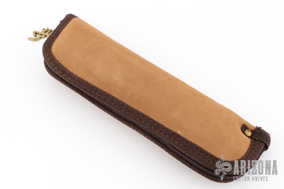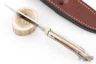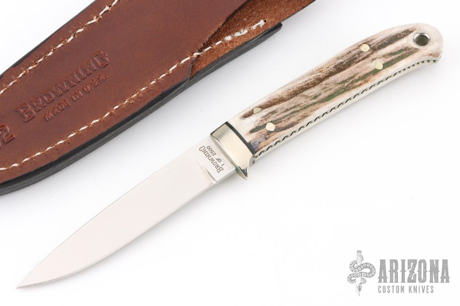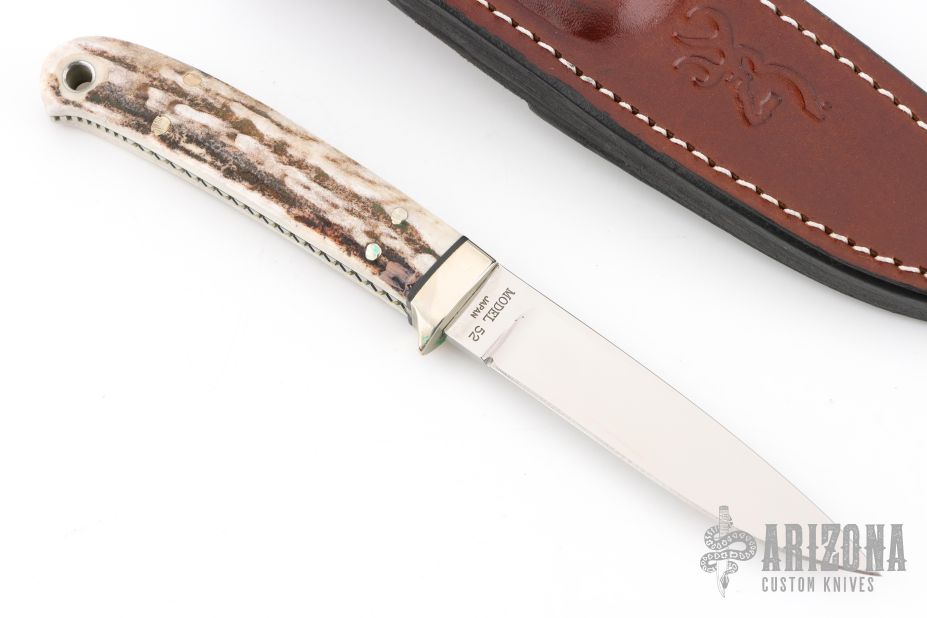 This Browning Model 52 Limited Edition features a mirror polished blade with .116" blade stock and .647" blade depth, full tapered tang construction. The handle has a nickel silver guard, stag scales with nickel silver pins, a lanyard hole and fileworked tang. Comes with original box, papers, brown leather sheath and zippered case. Excellent condition.