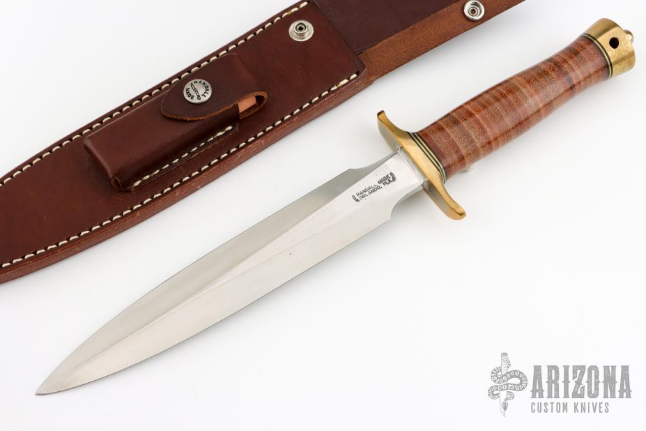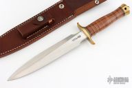 The Model 2-8 by Randall Made Knives has a brass guard, stacked leather commander style grip, brass butt cap and tang nut, black/brass spacers. Satin finished double edged blade, .221" blade stock and 1.34" blade depth, hidden tang construction. Comes with original brown leather sheath and zippered case. Has a few light scuffs, otherwise Excellent condition.