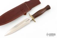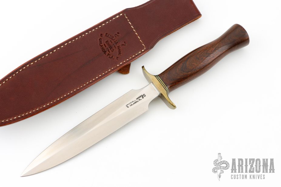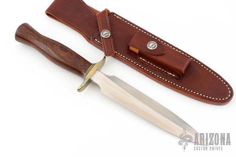 The Model 2-7 by Randall Made Knives is a heavily made dagger or dirk. Brass guard with a wood grip, brass/black spacers. Double-edged satin finished blade, .207" blade stock and 1.237" blade depth, hidden tang construction. Comes with original leather sheath and a zipper case. Has a couple light scuffs, excellent condition otherwise.