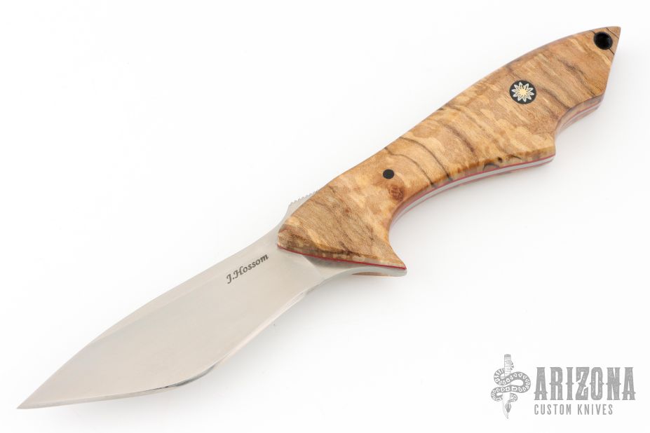 This Hunter by Jerry Hossom features nicely shaped wood scales with red liners, mosaic pin, and lanyard hole. The blade is hand-rubbed satin finished with notched thumb ramp, .162" blade stock and 1.081" blade depth, full tapered tang construction. Fits nicely in hand. Comes in a zipper case. Has a couple light scuffs, excellent condition otherwise.