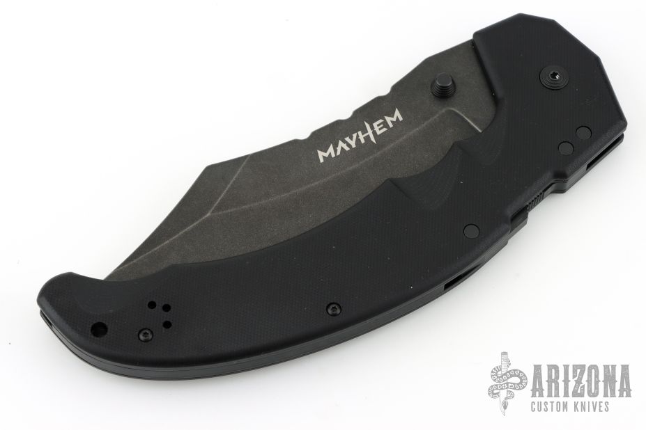 The FL-60DPL-BL Cold Steel Mayhem Knife is a tank of an EDC that features a 6 inch modified cleaver blade made of S35VN stainless steel, 4mm thick, with a blackout stonewash finish, a swedged tip, a notched spine for precise control, and dual thumb studs for ambidextrous one hand opening. The black G10 handle has ergonomic contours and milled grooves for secure grip, a sturdy Atlas™ Lock, a lanyard hole, and a side to side reversible pocket clip mounted at the butt end. Excellent condition.
