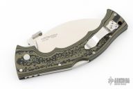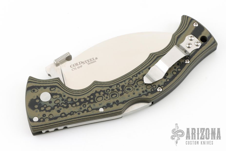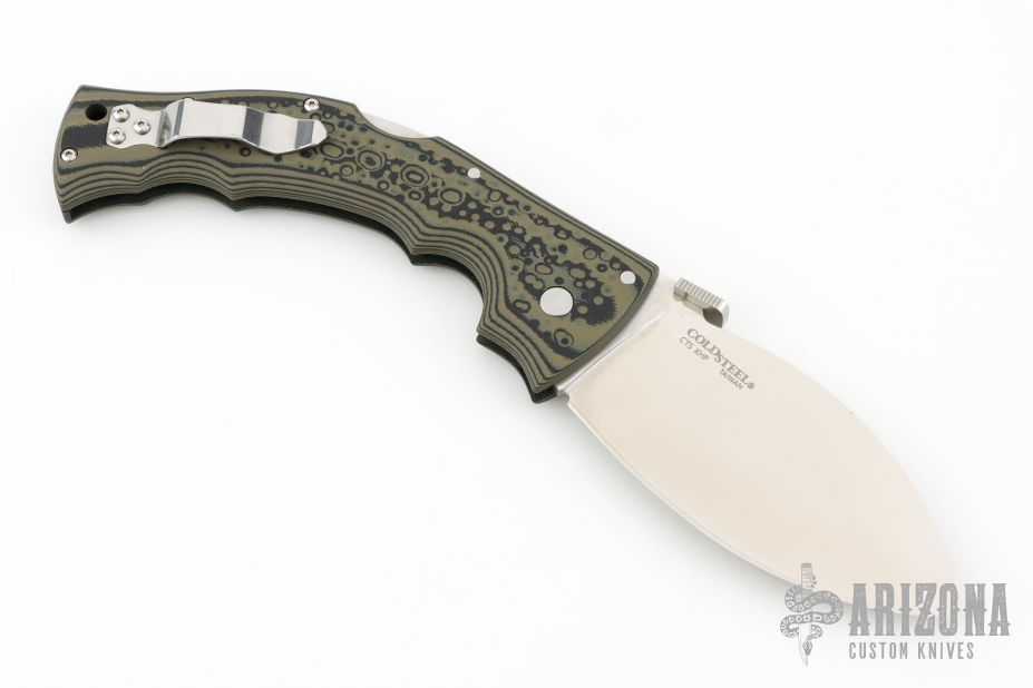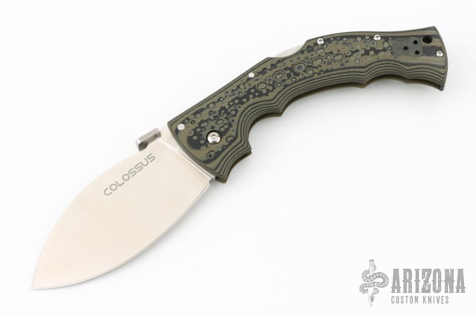 Designed by custom knife maker Mike Wallace, the Colossus is quite simply a cutting machine! Its extra-broad blade is fully flat ground, with a continuous curve that facilitates amazing shearing cuts! Made to pack as much cutting performance* into a 4 blade limit as possible, the Colossus was inspired by one simple design philosophy when it comes to cutting: If you can’t go long –go wide! Made from premium American CTS XHP steel, this beast of a blade is just perfect for everyday utility use and cutting chores. Zipping through even tough material like a hot knife through butter! The 3D CNC machined textured, and stippled two-tone American G-10 handle is not only incredibly comfortable both in the hand and in the pocket, but it also houses what is arguably the strongest lock in the industry! The Cold Steel Tri-Ad has proven itself time and time again as an unbelievably strong and safe locking mechanism – a perfect choice for a knife with this much cutting potential! Satin finished blade.