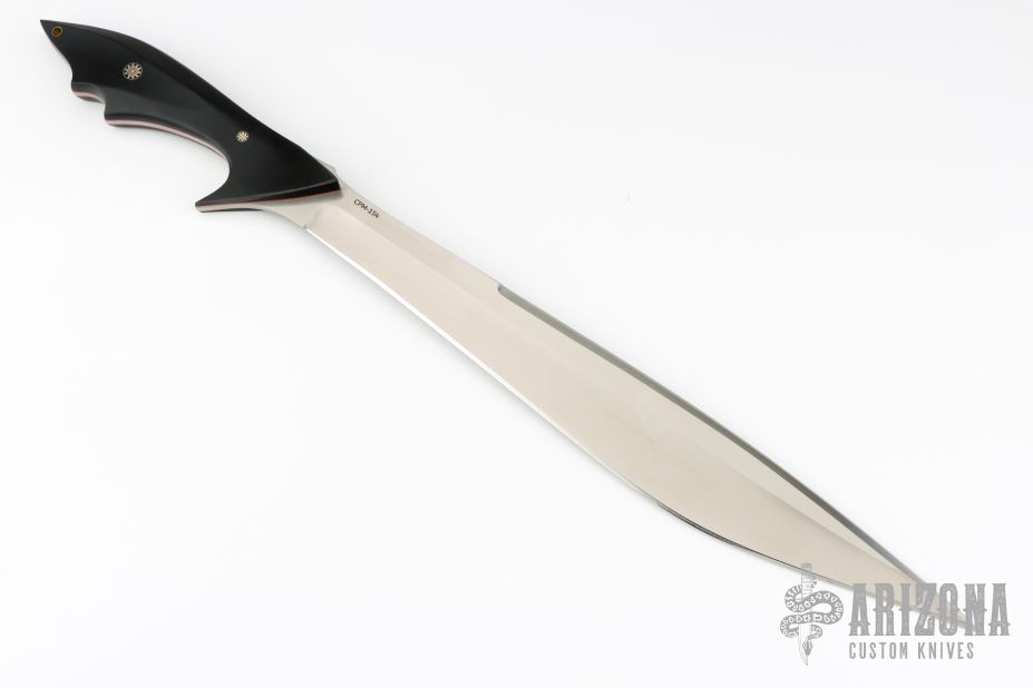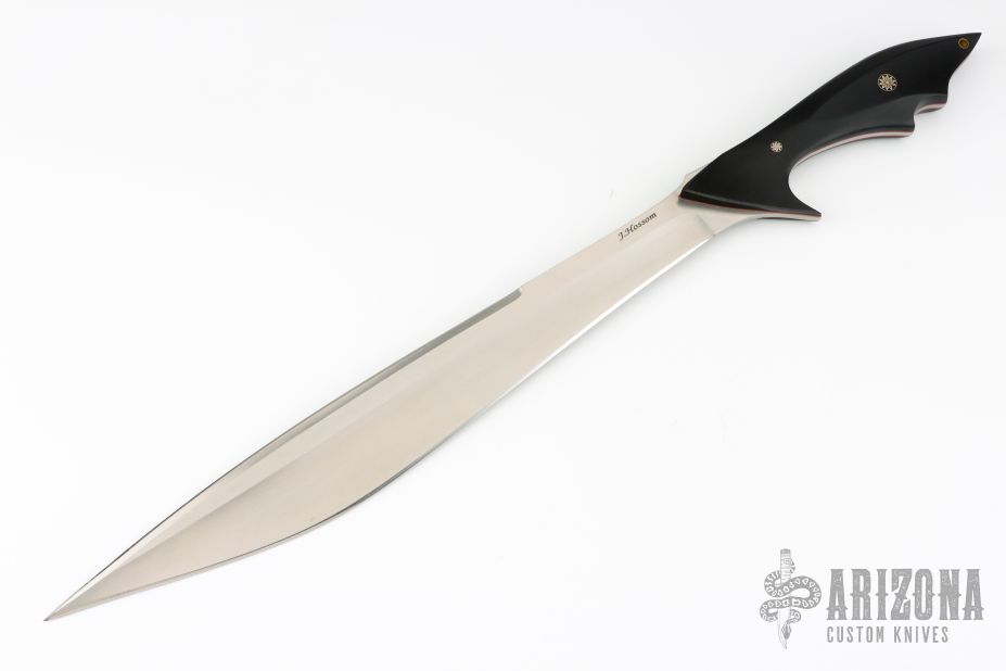 This short sword by Jerry Hossom features nicely shaped black paper micarta scales with mosaic pins and red liners. Hand rubbed satin finished recurve blade with notched thumbrest and sharpened top edge, .188" blade stock and 1.936" blade depth, full tapered tang construction. Fits nicely in hand. Includes a zippered case. Excellent condition.
