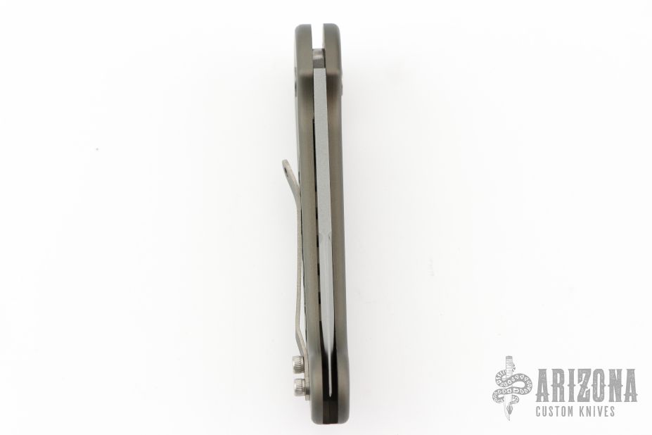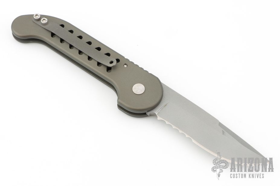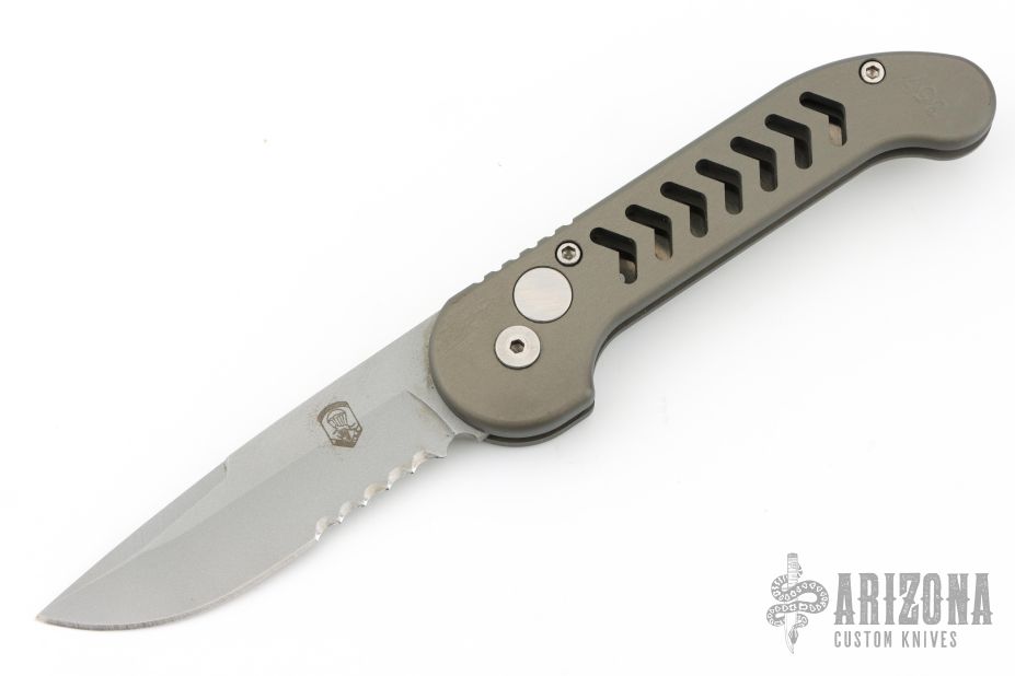 This Slim Seal Auto from Rob Dalton has a two-tone partially serrated blade with false top edge. Handle is aluminum with milled "V" pattern and tip up titanium clip. #357. Has a couple light scuffs, otherwise excellent condition.