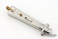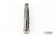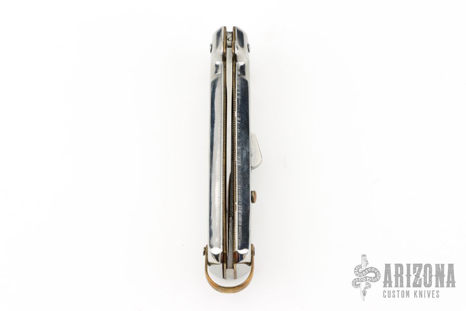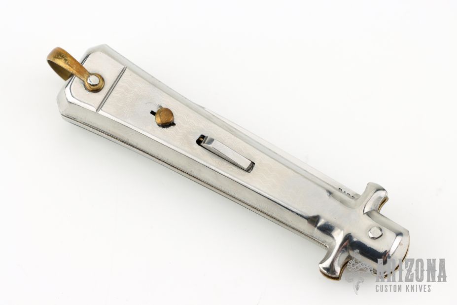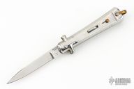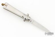 This Automatic by Bargeon features a mirror finished drop point blade with swedge. The handle has stainless steel scales over coin edged brass liners and stainless steel backspacer. Push button release, sliding safety and brass lanyard bail. Excellent condition. Comes with original box.