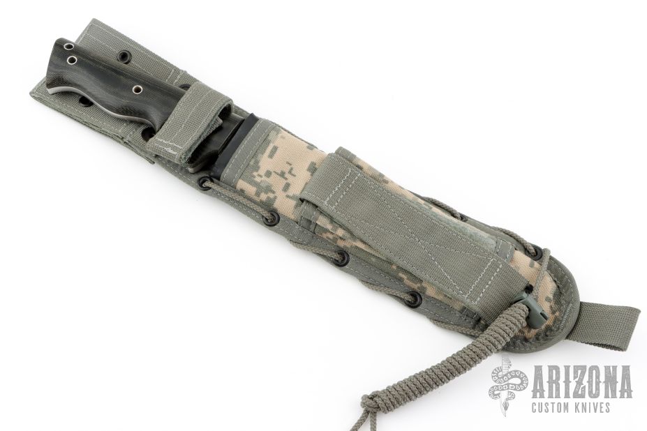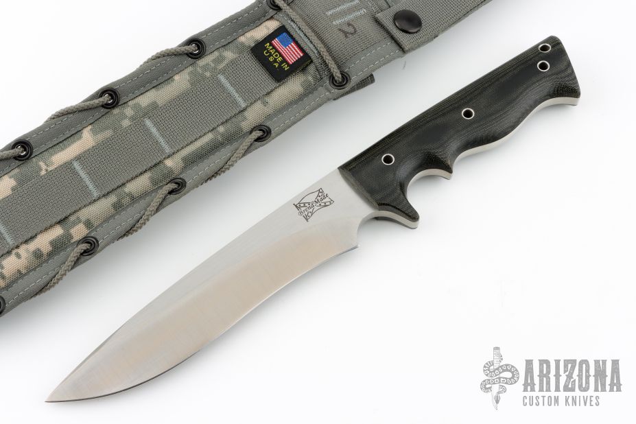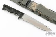 This knife is from Walter Brend's "Rescue Series". It features a satin finished recurve blade hand ground by Walter, .262" blade stock and 1.616" blade depth, full tang construction. The handle has black canvas micarta scales. Hollow tube pins and lanyard hole. Comes with a spec ops nylon sheath, and zipper case. Excellent condition.
