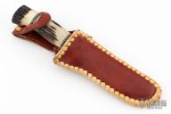 This Morseth Stag Skinner has a satin finished clip point blade with hidden tang, .183" blade stock and 1.190" blade depth. Handle is stag antler with a nickel silver guard and black, white and red spacers. Comes with custom Morseth brown leather sheath with belt loop. Has some scratches and light patina on the blade, has been resharpened, otherwise good condition for its age.