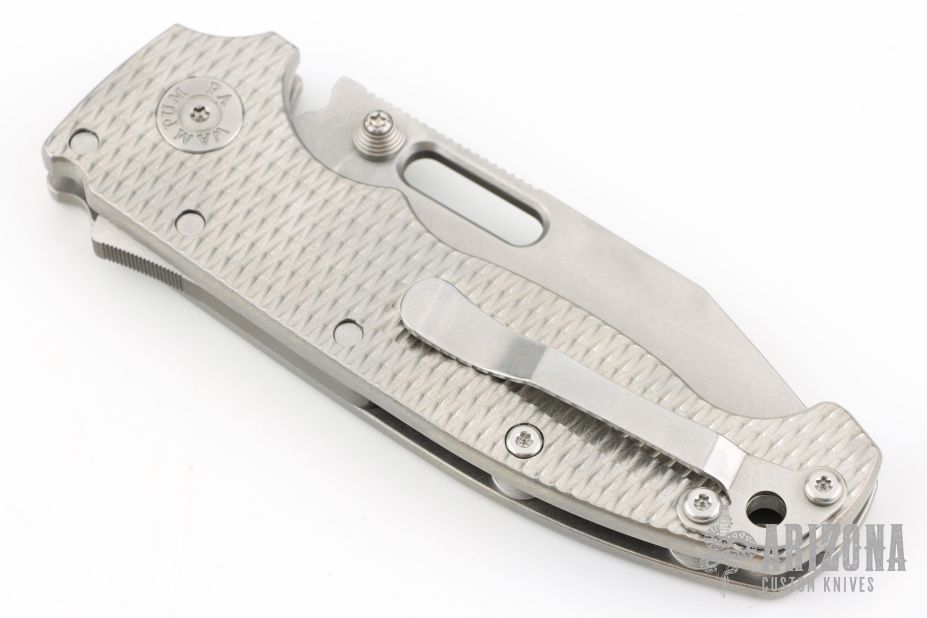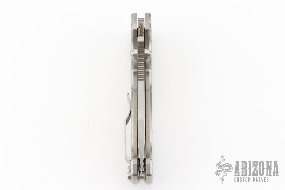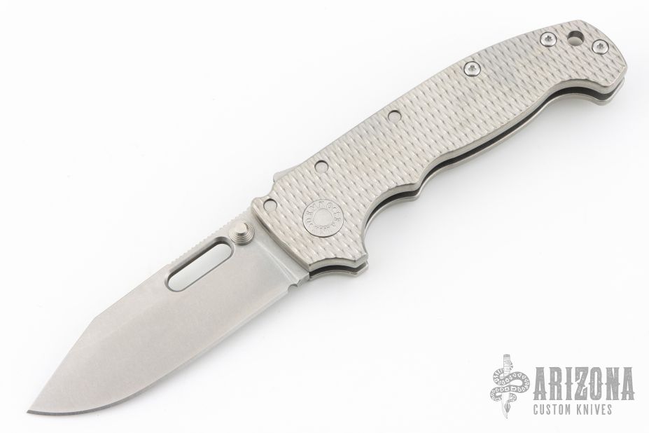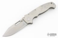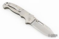 This AD20 by Demko Knives features a stonewashed blade with notched thumbrest, dual thumbstuds and a thumbhole.  The handle has a textured titanium frame with a tip up stainless steel clip and "Shark" lock release on the spine. Comes with original box. Excellent condition.