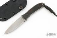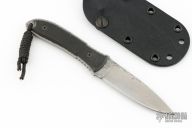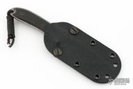 This neck knife by Kit Carson has a Damascus drop point blade, .110" blade stock and .703" blade depth, full tang construction. The handle has black G-10 scales and a lanyard hole. Comes with a kydex neck sheath, zipper case and COA. Has a couple small oxidation spots and scratches, otherwise excellent condition.