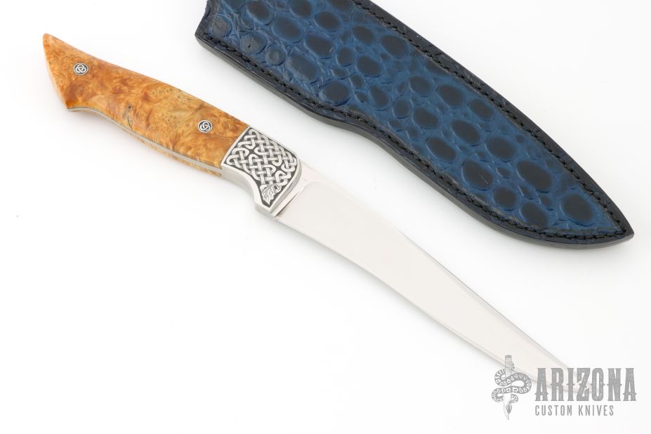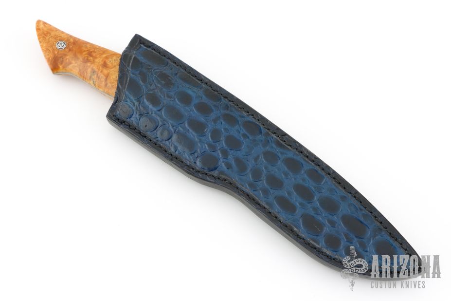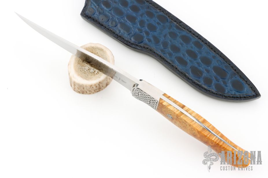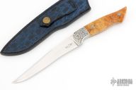 This Hunter by Neels Roos features a hand rub satin finished blade with false top edge, .154" blade stock and 1.126" blade depth, full tapered tang construction. The handle has engraved and dovetailed stainless steel bolsters, maple burl wood scales with engraved pins. Comes with a black/blue leather sheath. Excellent condition.
