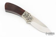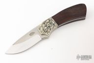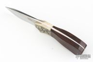This hunter by Harold Brown features a drop point blade with polished bevels, hand satin flats, .163" blade stock and 1.181" blade depth, full tapered tang construction. The handle has dovetailed and engraved nickel silver bolsters, with a wood grip. Comes with a zippered case. Has some light scuffs, and patina. Excellent condition.