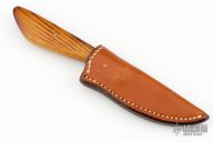 This Knife by Master Smith Ray Kirk features a hand hand forged and satin finished spear point blade with false top edge and hammer marked flats, integral guard and hidden tang construction, .202" blade stock and .964" blade depth. The handle has a wood grip with single pin. Comes with a brown leather sheath and Bill's case. Excellent condition.