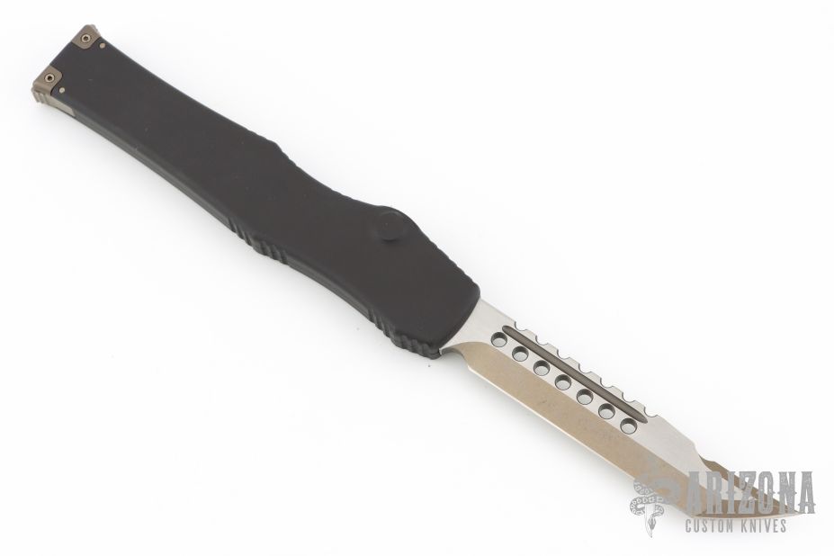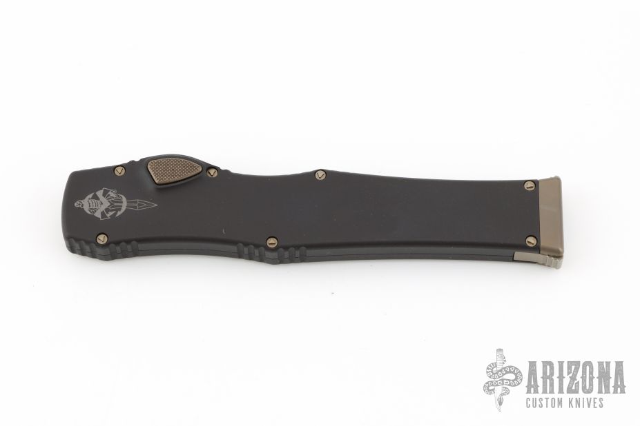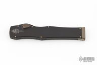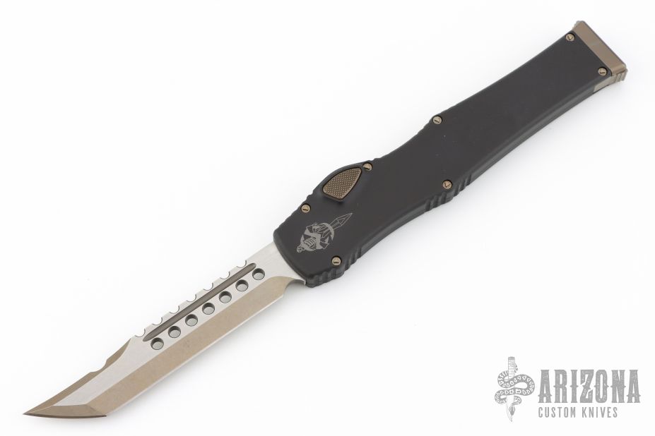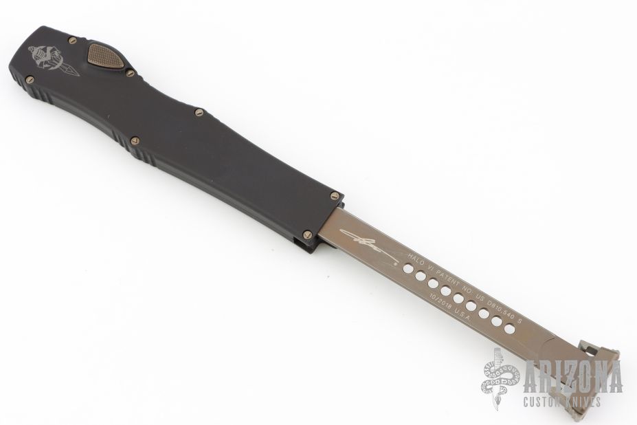 This Signature Series Halo VI features a bronzed Hellhound tanto blade with satin flats, fullers and notched spine. Its handle is made from black Mil-Spec anodized alloy with bronzed hardware. The charging handle comes marked with the Microtech logo and date of creation along with the serial number. Microtech's Halo VI sets itself apart from previous models with added safety features and an improved charging handle mechanism. . Its upgraded charging handle is built with dual pivoting latches that create a secure seal in the closed position. Comes with original box, kydex sheath and papers. Dated 10/2018. Excellent condition.