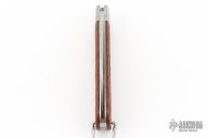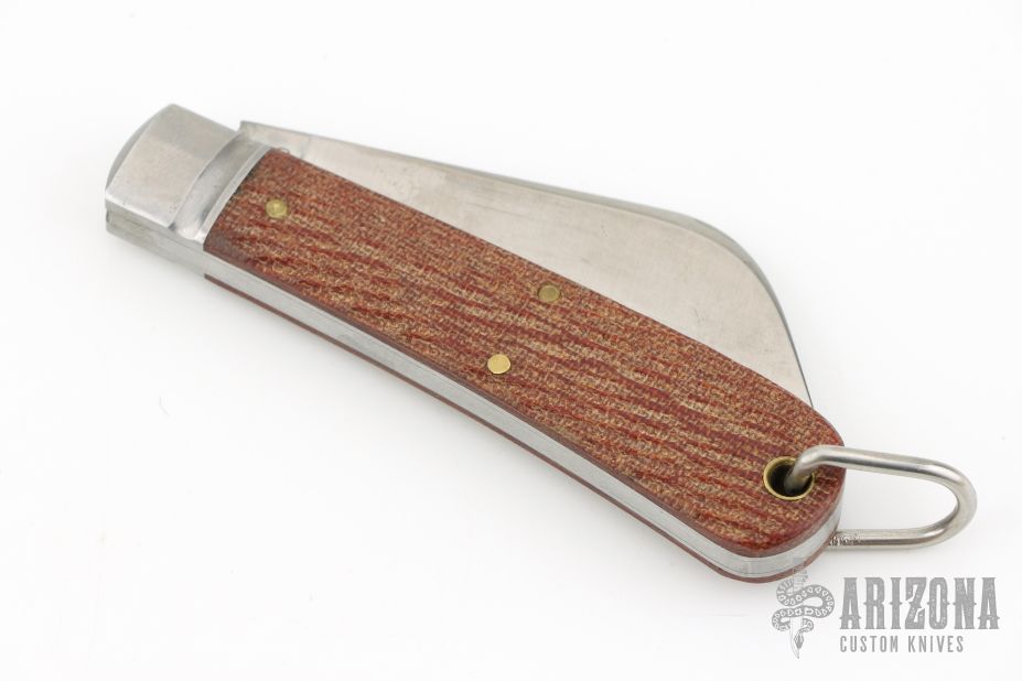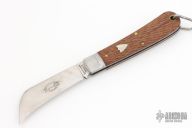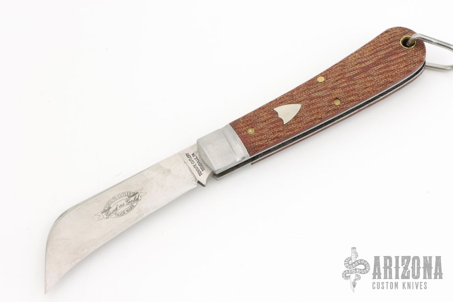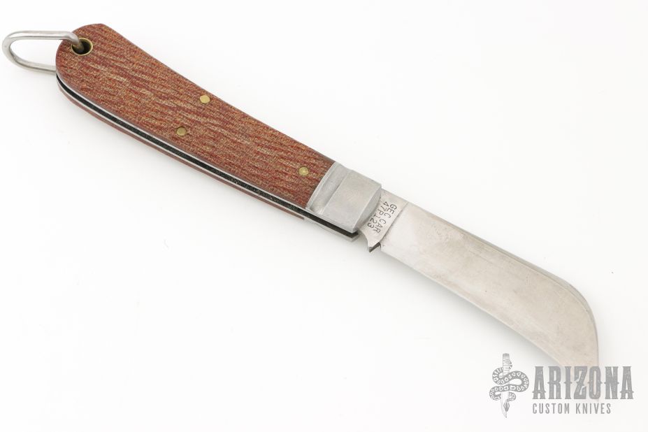 This Harvester from Great Eastern Cutlery features a satin finished hawkbill style blade with swedge. The handle has pinched and fluted steel bolsters, micarta covers over brass liners and stainless steel spring, lanyard hole at butt. Has Half-stop. Comes with original packaging.  Has some scratches, otherwise good condition.