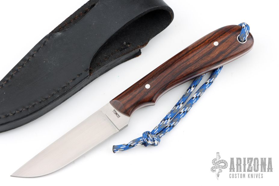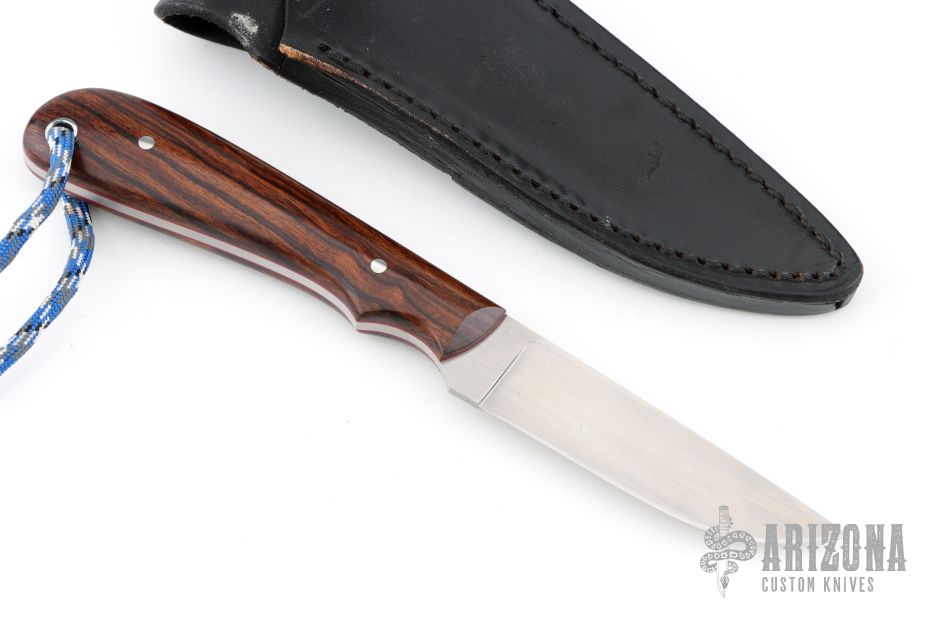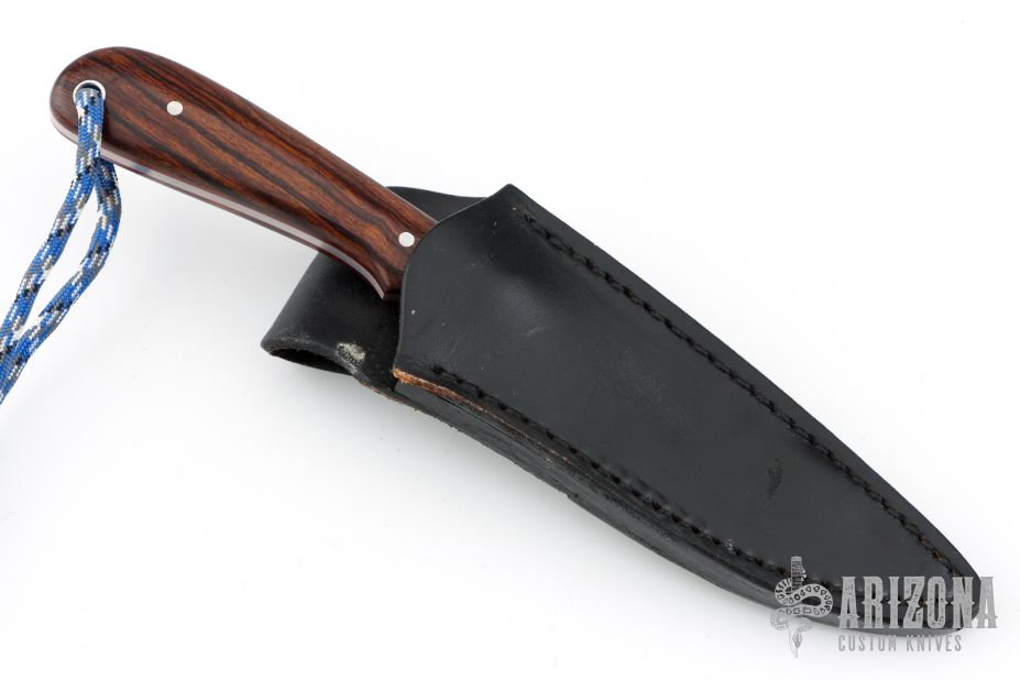 This knife by Brett Dowell features a hand rub satin finished blade with .109" blade stock and .791" blade depth, full tang construction. The handle has pinned wood scales with red liners. Lanyard tube in pommel. Includes a black leather sheath with belt loop and zipper case. Has a couple light scuffs, otherwise Excellent condition.