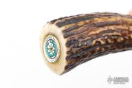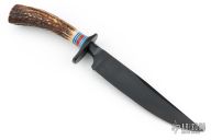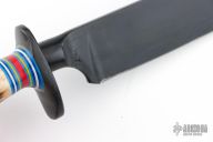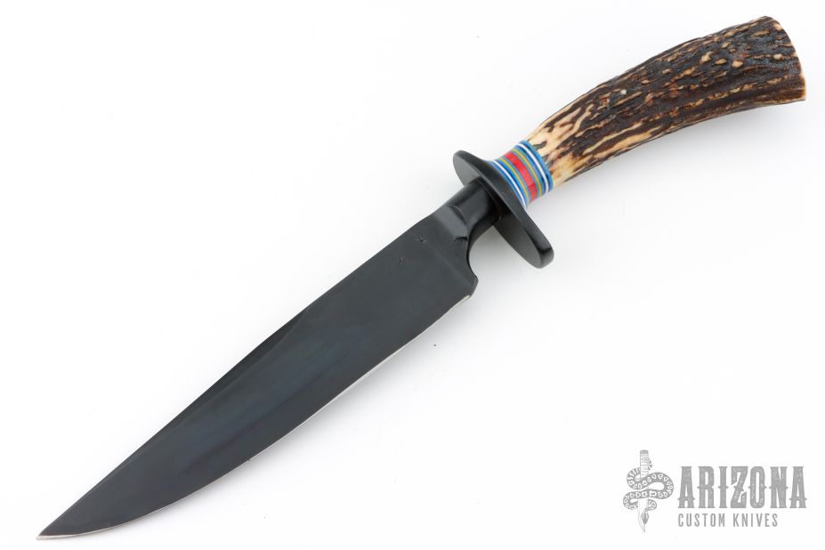This Fighter by Ray Kirk features a black coated blade with false top edge, .253" blade stock and 1.439" blade depth, hidden tang construction. The handle features a black guard, blue/white/yellow/red spacer pattern, and a stag grip with the Seal Of The Cherokee Nation inlay in pommel. Comes with a zipper case. Has some light scuffs and scratches, excellent condition.