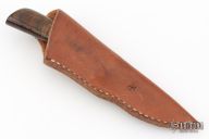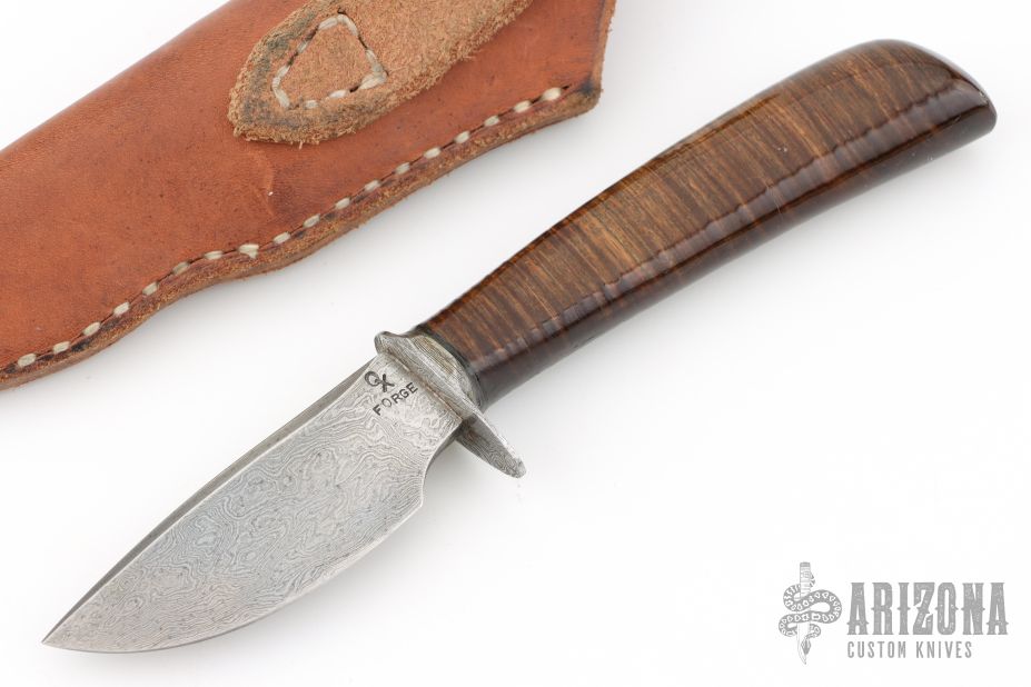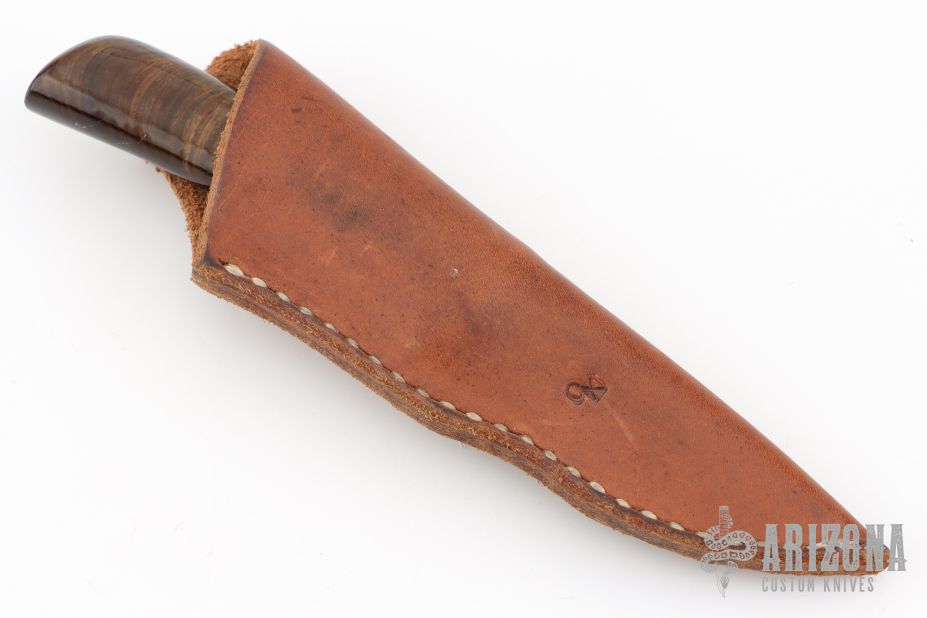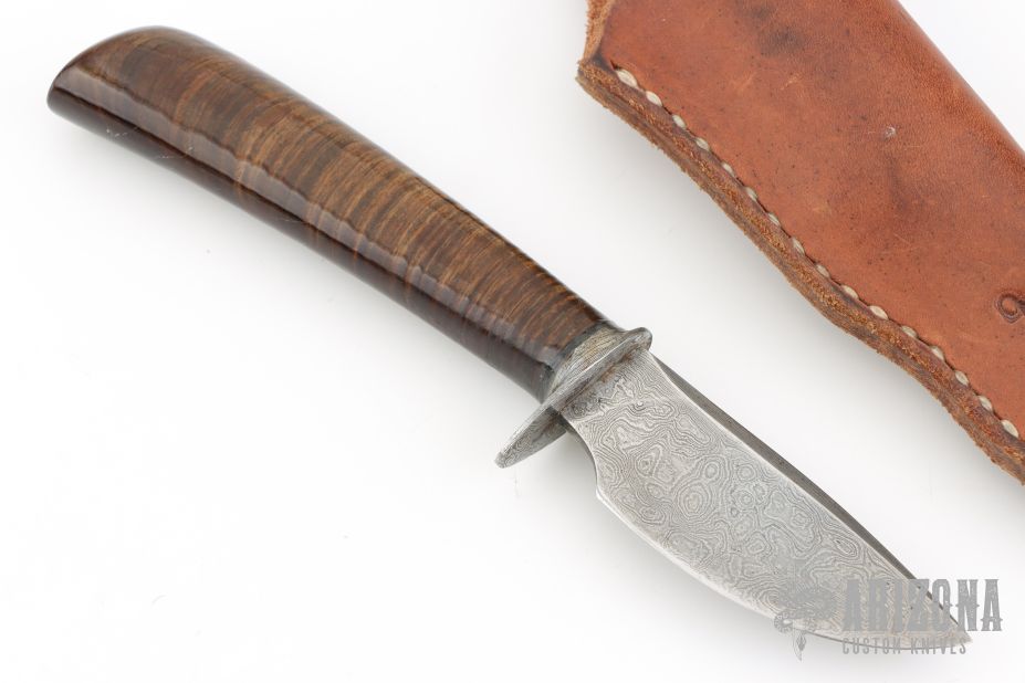This Skinner from Charles Ochs features a Damascus blade with hidden tang construction, .162" blade stock and 1.060" blade depth. The handle has a Damascus guard with a wood grip. Includes a brown leather sheath. Has some light patina, some cracking in the finish of the handle, I don't think the wood is cracked, just the polyurathane used to finish it, otherwise excellent condition.