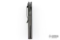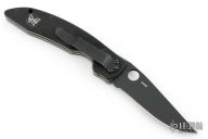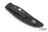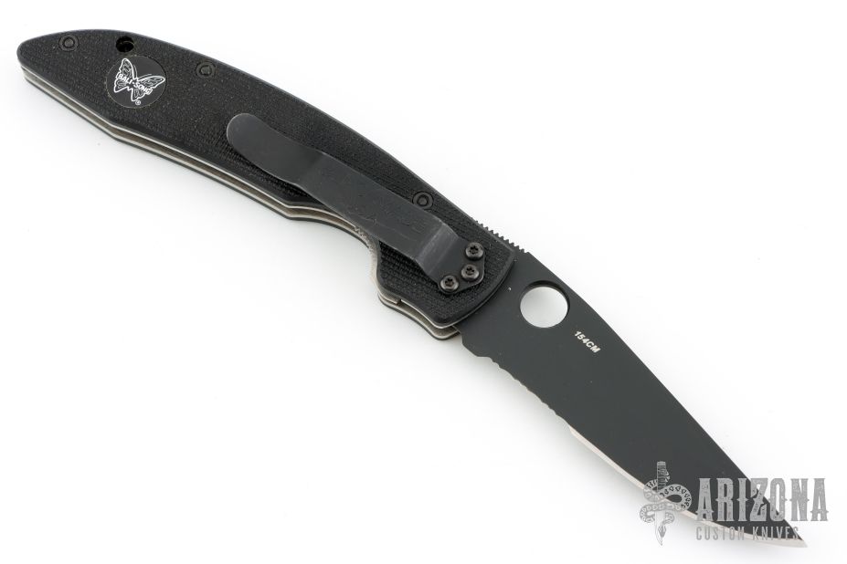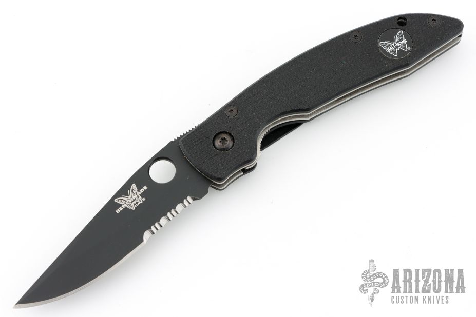 This Mini AFCK linerlock folder from Benchmade has a black coated blade with partial serrations, thumb hole, and notched thumb rest. Handle is black G10 over stainless liners, black fiber back spacer, lanyard hole. Comes with original box. Excellent condition.