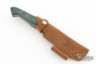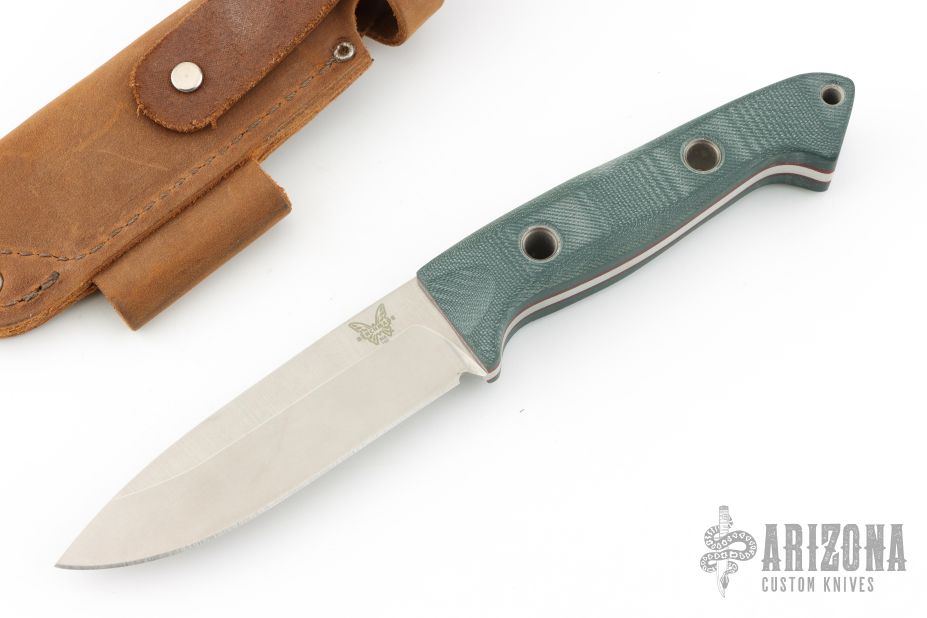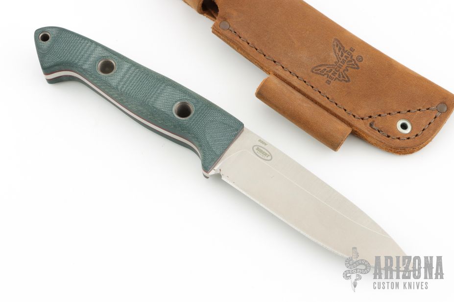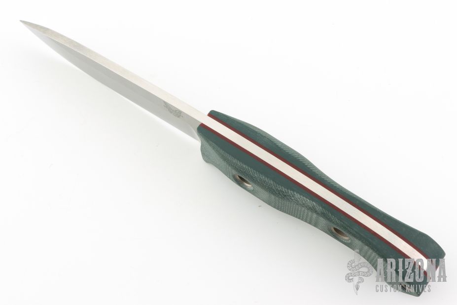 This Bushcrafter from Benchmade features a drop point tumble finished blade with .165" blade stock and 1.177" blade depth, full tang construction. The handle has green G10 scales over red liners and full tang construction with hollow pins and a lanyard tube with lanyard. Includes leather sheath with a belt loop. Excellent Condition. Comes with original box and papers.