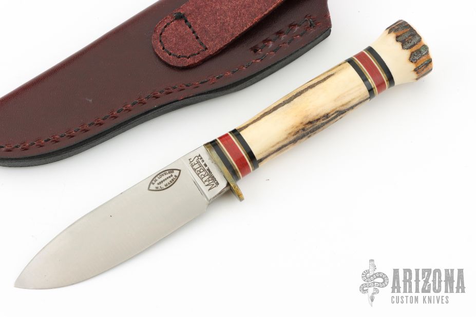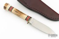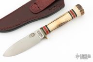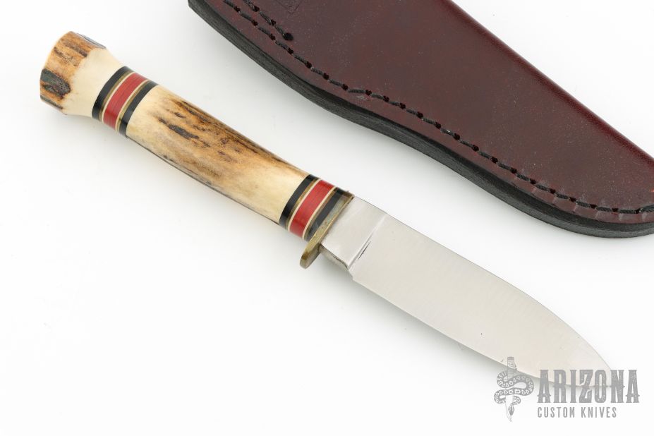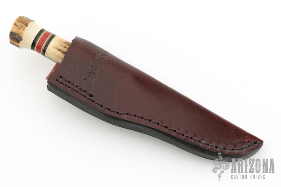 The knife has a satin finished blade with .210" blade stock and .957" blade depth, hidden tang construction. The handle has a brass guard, aluminum butt, stag grip, black/brass/white/red spacers. Comes with brown leather sheath and original box. Excellent condition.