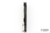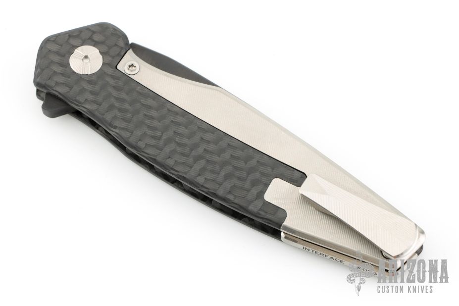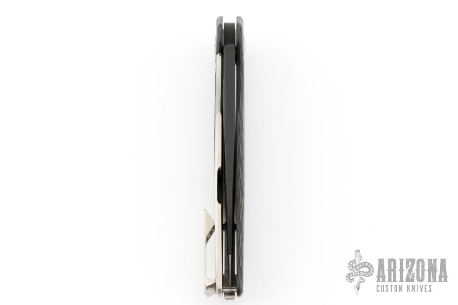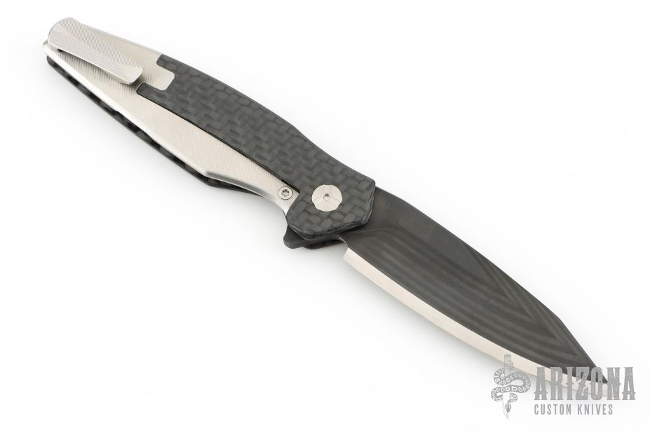 An ultralight weight, medium duty, flipper style folding pocket knife. Designed to be extremely light weight while still retaining full size (3.6” blade). With its carbon fiber bodied plain edge flat ground blade the entire knife weighs a mere 1.7 oz. The titanium hardware, handle scales and pocket clip are all 3d CNC machined, designed for comfort and ease of use. The action rides on fully ceramic custom bearings and snaps open incredibly fast using the flipper tab. It has a characteristic and satisfying double click opening action sound. The knife is mostly carbon fiber but uses a variation on the titanium integral frame lock design to keep the knife open against hardened steel inserts. Each piece is engraved with the model name and individual serial number on the backspacer. Each knife is machined, heat treated, hand finished, tested in house and proudly made in the USA.