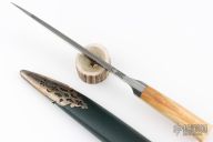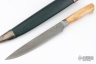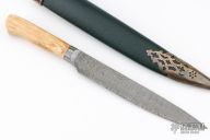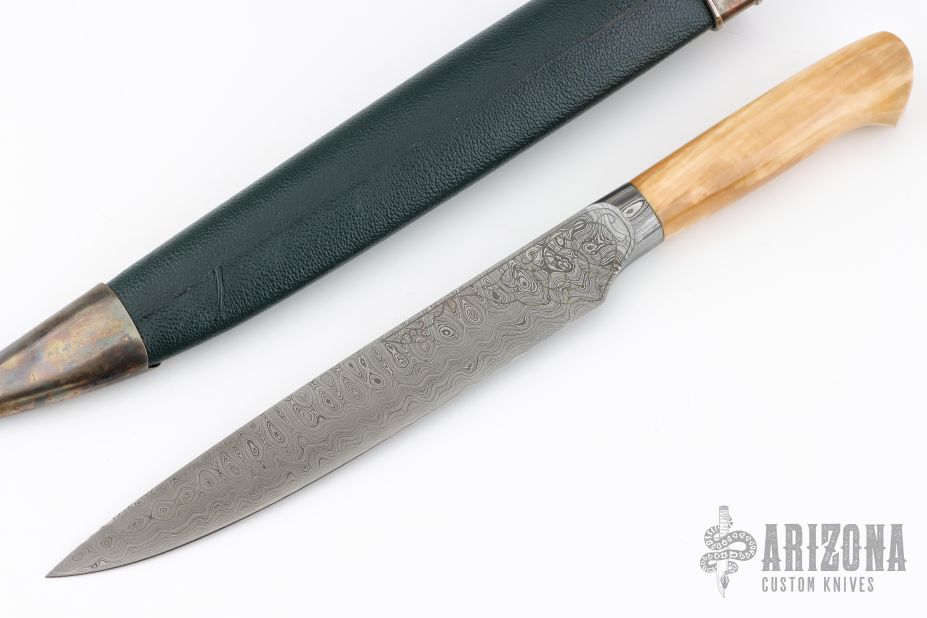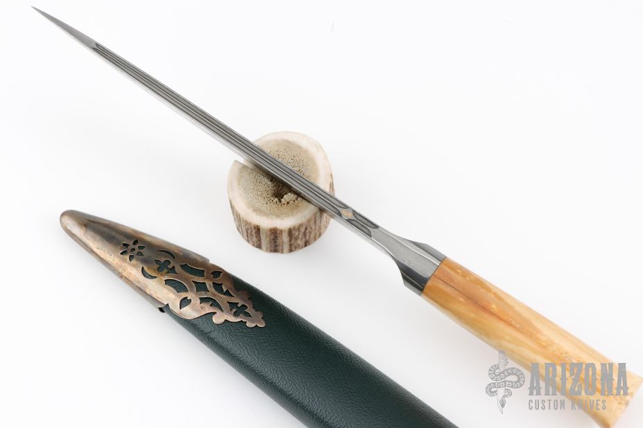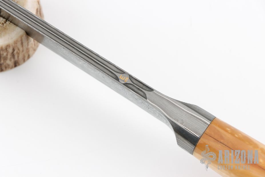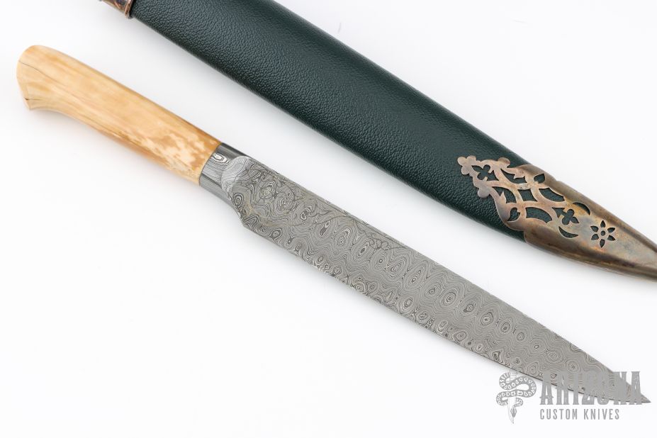 This Persian Kard from Vince Evans features a 512 layer Damascus (1095/A203) drop point blade with fluted blade spine, gold inlays, .29" blade stock, 1.117" blade depth, integral, hidden tang construction. Very nice silver inlays on the blade. The handle is comprised of a fossil walrus ivory grip with no visible hardware or fastener. The listing includes a traditional wood/leather scabbard. Also comes with original purchase receipt, and photo of the knife by PointSeven Studios. Comes with a zipper case. Excellent condition.