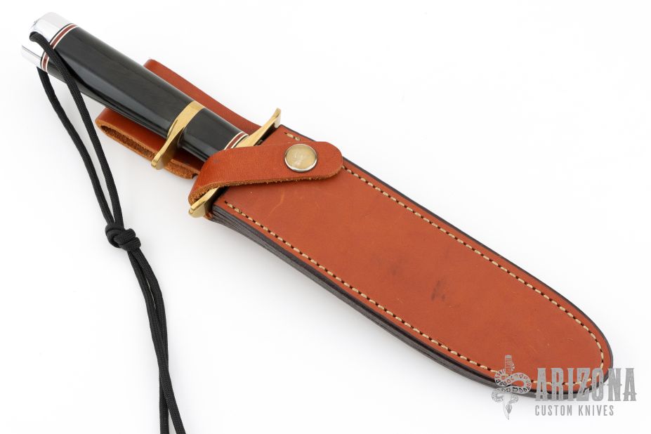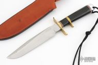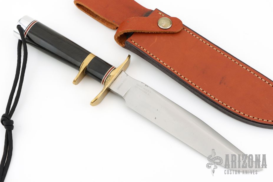 This Model 1-7 Subhilt from Blackjack Knives features a satin finished blade with false top edge, .214" blade stock and 1.204" blade depth, hidden tang construction. The handle is comprised of a brass guard and sub-hilt with red, white and blue spacers, black linen micarta handle and aluminum pommel with lanyard hole. Includes original box and brown leather sheath with belt loop. Has some small oxidation spots, otherwise excellent condition.