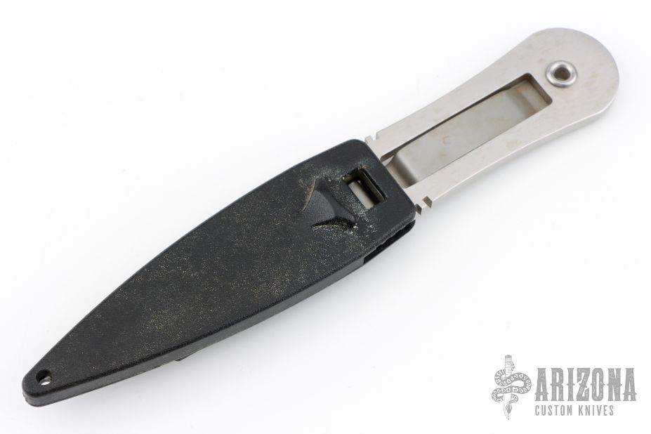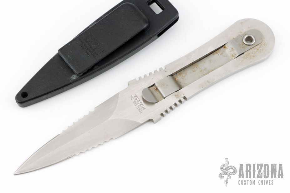 This boot knife by Gerber is a Blackie Collins design, it features a satin finished blade with partially serrated edges, .169" blade stock and 1.075" blade depth, full tang construction. The handle has a clip that holds it in the sheath. Comes with black plastic sheath and a zipper case. Has a few light scratches, otherwise excellent condition.