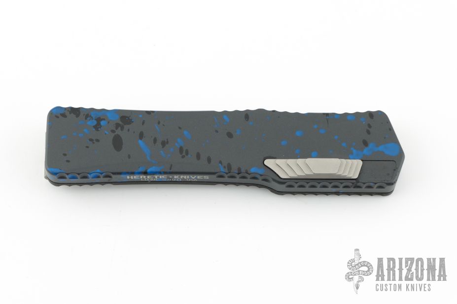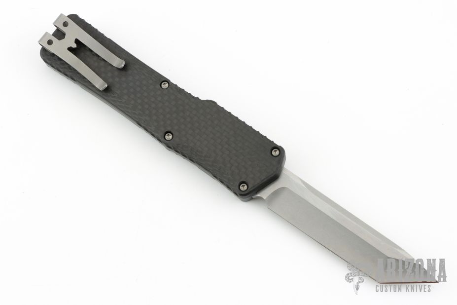 This Cleric OTF by Heretic Knives features a stonewashed tanto blade. The handle has a carbon fiber and aluminum frame with a stepped and bead blasted stainless steel thumbslide and bead blasted stainless steel tip down clip. Comes with original box and papers. Excellent condition. #031.