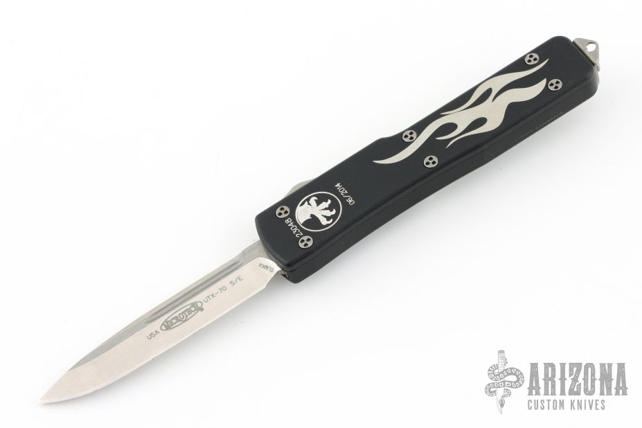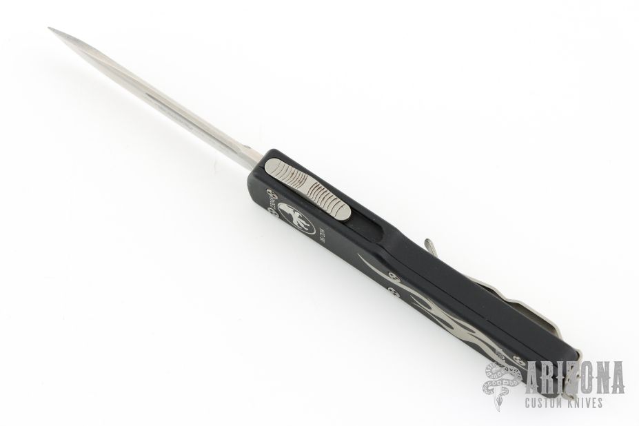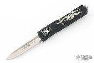 This UTX-70 OTF automatic features a stonewashed blade with a standard edge. Has a black aluminum frame with a blasted tip down pocket clip and glass breaker. Has flames on the front of the frame. Comes with a zippered case. Has some light scuffs, otherwise excellent condition. #23048 and dated 06/2014.