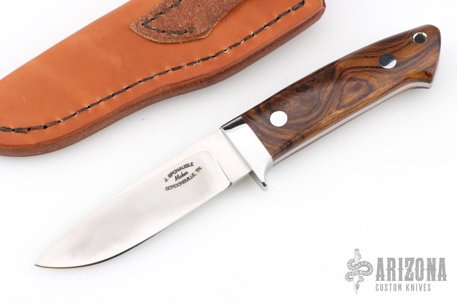 "I crafted my first knife while in elementary school and still have it today. It is a sentimental piece to me because it reminds me of my father and hunting in the mountains as a boy. Today I hand craft knives for the common hunter as well as the avid collector. I take into consideration the needs of the active hunter and add a mirrored finish and rare handle material for a knife that any outdoorsman would be proud to call his own. I have come a long way from that wooden carved knife in elementary school. Today I use a Bader grinder to hollow grind. My knives have a full tapered tang and nickel silver or stainless steel hand guards. They are professionally heat treated in an atmospheric controlled furnace. My favorite steels to work with are ATS 34 or 154CM. I have also spent the past 39 years as a tool maker at TRW in Lebanon, TN. This has been a great asset to my hobby as a knife maker. I make each knife with great attention to quality and detail as if it were my own. After seeing the knife go from raw material to finished product I'm very proud to have the Sponaugle name on it. I believe that it represents all that is desired in a true hunter's tool."