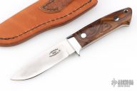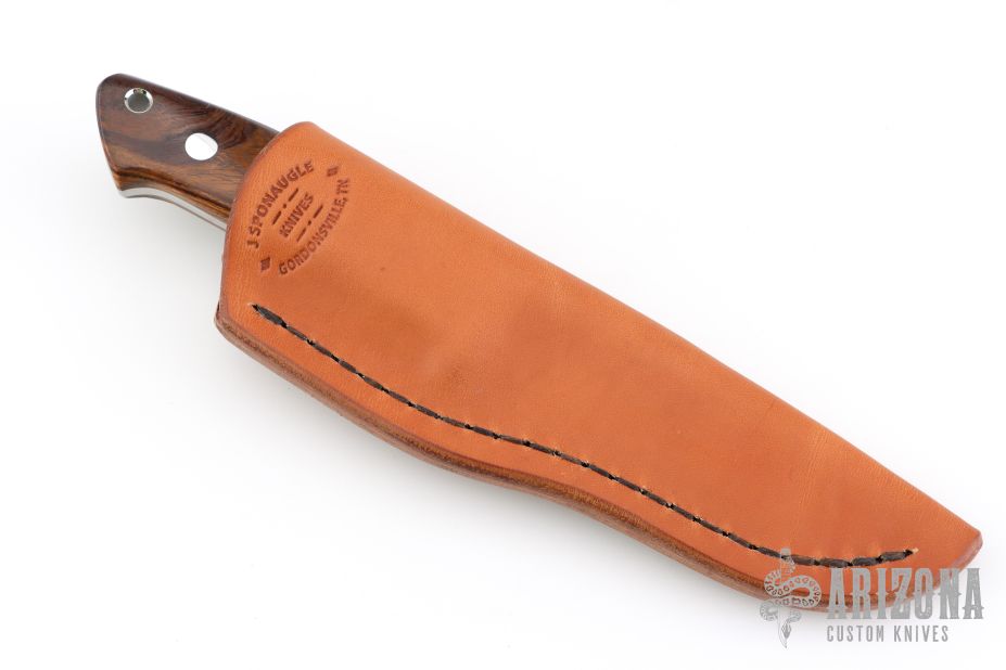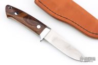 This Small Drop Point Hunter from James Sponaugle features a satin finished blade with .148" blade stock and 1.068" blade depth, full tapered tang construction. The handle has a mirror polished stainless steel guard with Arizona desert ironwood scales over red liners/spacers. Includes leather sheath with belt loop. New from maker!