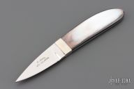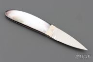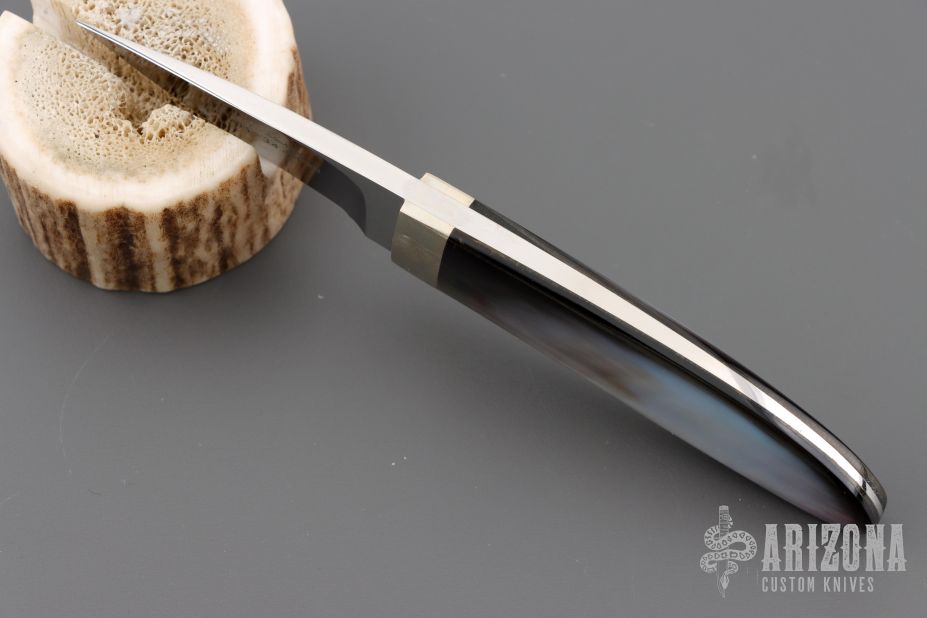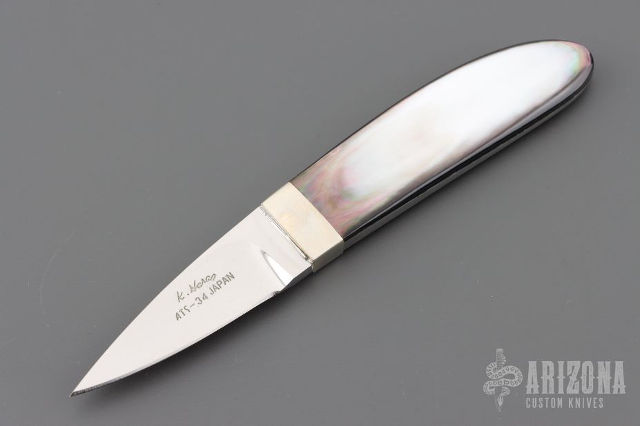 This Eagle Claw from Koji Hara features a mirror polished blade with .149" blade stock and .70" blade depth, full tapered tang construction. The handle is comprised of nickel silver bolsters and pearl scales. Has a couple light scratches, excellent condition otherwise.