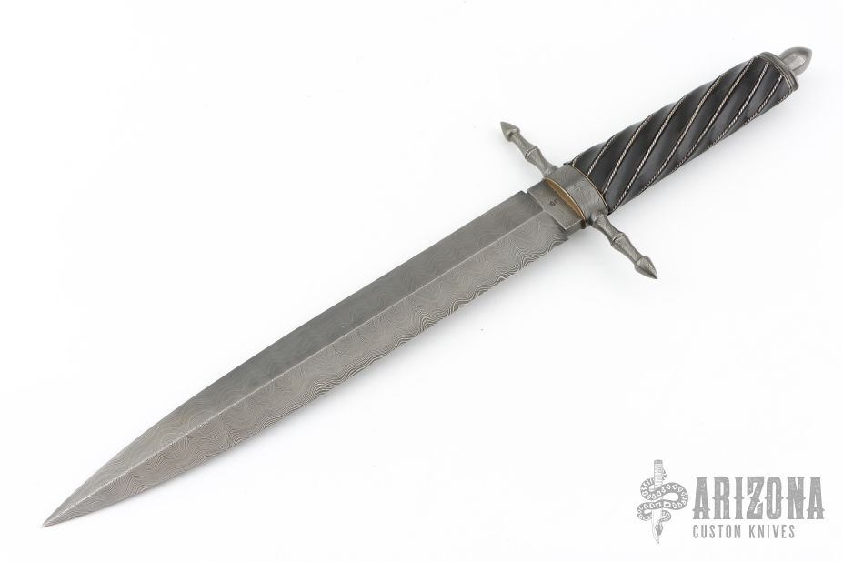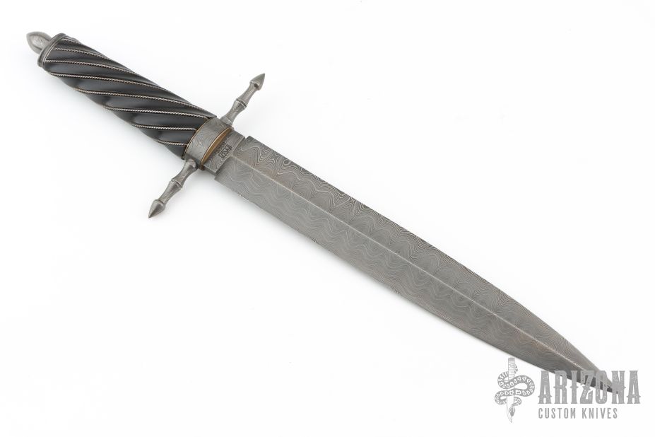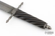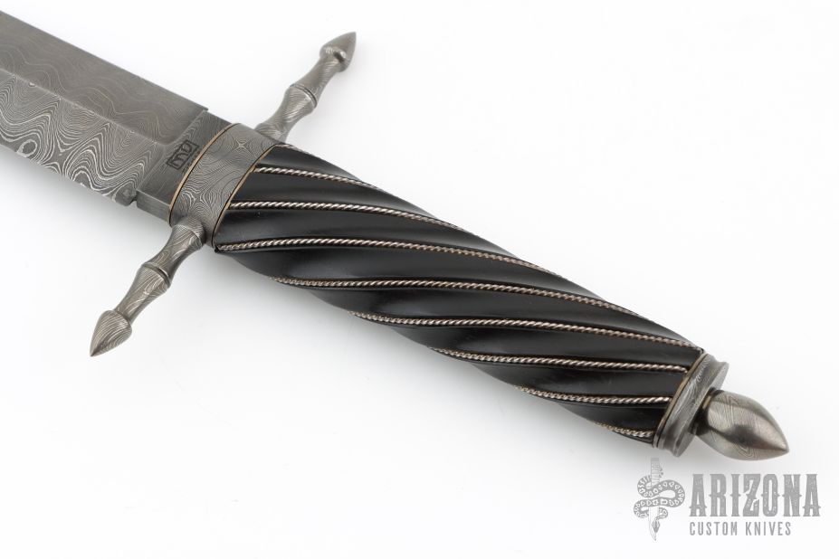 This Quillon Dagger by Master Smith Mike Vagnino features a Damascus (Ladder Pattern 1084/15N20) double edged blade with .261" blade stock and 1.337" blade depth, hidden tang construction. The handle has a Damascus quillion guard and fluted butt, spiral fluted ebony grip with twisted silver wire inlays. Comes with original purchase receipt, zipper case, and photographs of the knife. Very impressive work. This is a Test Dagger submitted to the ABS for the maker to pass and receive their Master Smith rating.