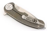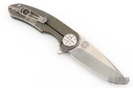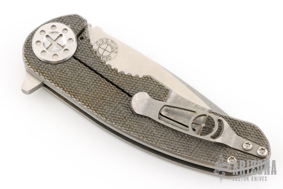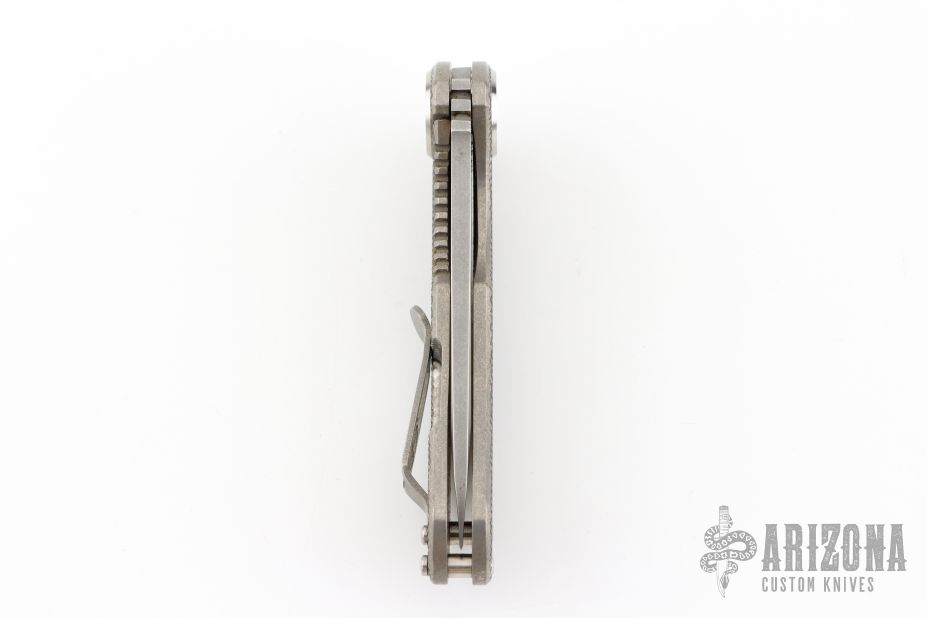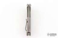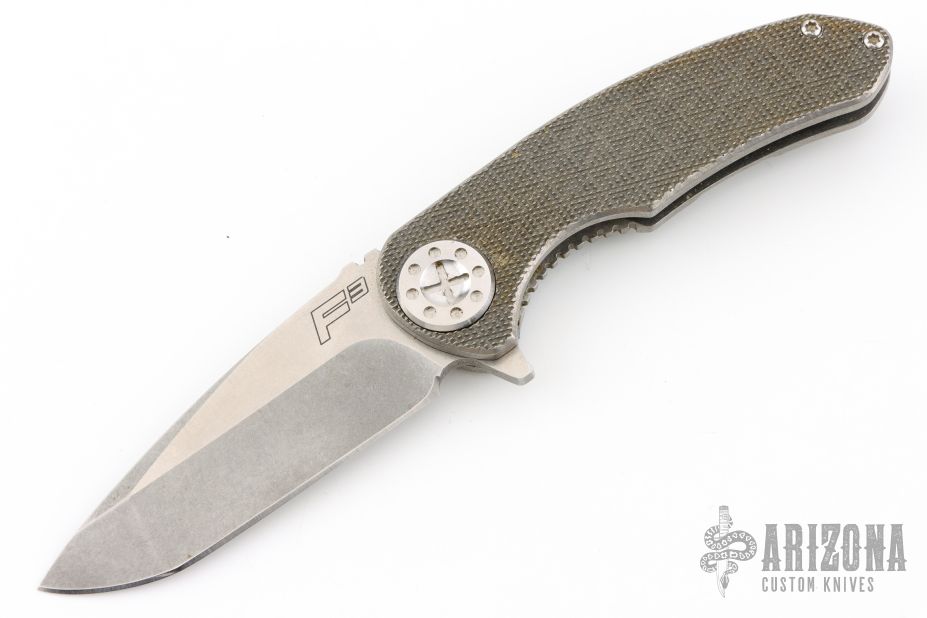 This F3 Medium by Curtiss Knives features a stonewashed blade with notched thumbrest and flipper. The handle has a checker milled and stonewashed titanium frame with a titanium tip up clip. Smooth and fast opening using a Caged Bearing System. Nice blade seating, detent and lock up. Excellent condition.