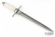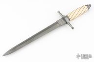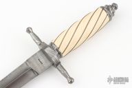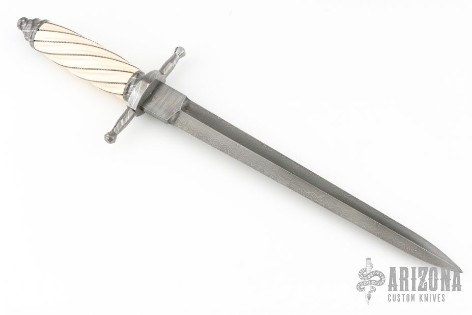 This Quillon Dagger by Master Smith Ray Kirk features a Damascus (52100/15N20) double edged blade with .252" blade stock and 1.049" blade depth, hidden tang construction. The handle has a Damascus quillon guard and fluted butt, spiral fluted grip with twisted silver wire inlays. Comes with a zipper case, photos/documentaion of the creation process, and COA signed and dated 6/4/2005. Very impressive work. This is a Test Dagger submitted to the ABS for the maker to pass and receive their Master Smith rating.