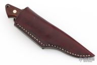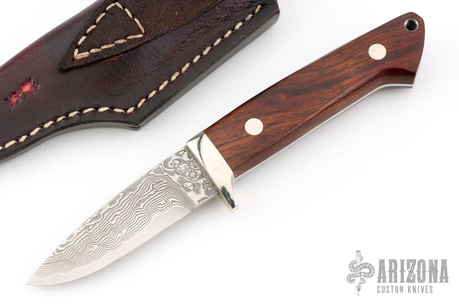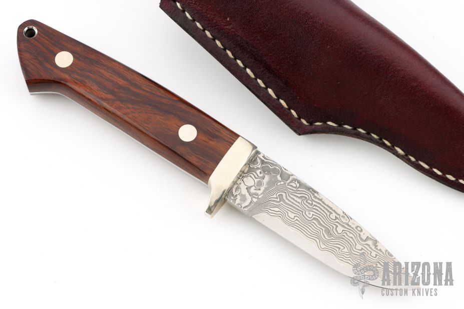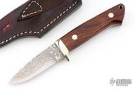 This Hunter by Mr. Itou features a drop point San Mai Damascus blade with 0.126" blade stock and 0.923" blade depth. The handle is comprised of a nickel silver guard with Desert Ironwood scales, nickel silver pins and steel lanyard tube over full tapered tang construction. Includes leather sheath with belt loop and clip. Excellent condition.