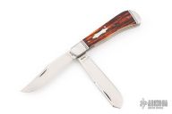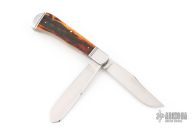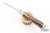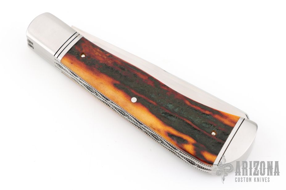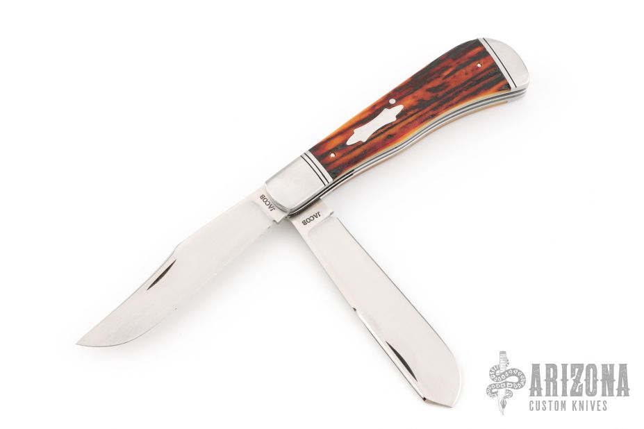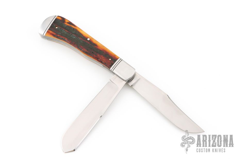 This 2-Blade Trapper by Phil Jacob features hand rub satin finished blades with nail nicks.  The handle has threaded stainless steel bolsters, stag covers over fileworked stainless steel liners and springs with Roman Knot filework.  Has half-stops, flush in all positions. Comes with zippered case.  Has a few light scratches on the bolsters otherwise the knife is in excellent condition.