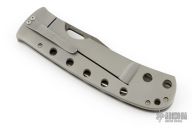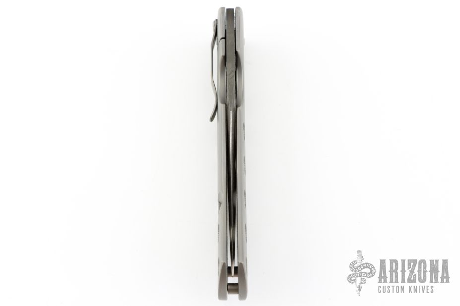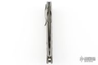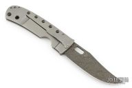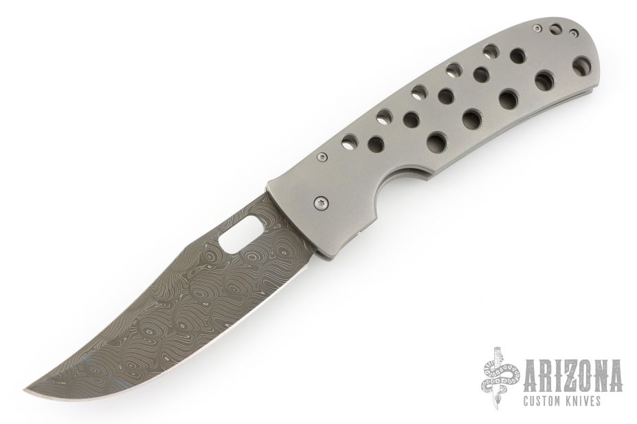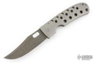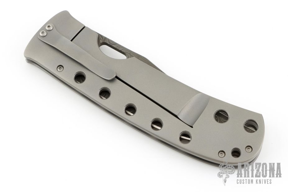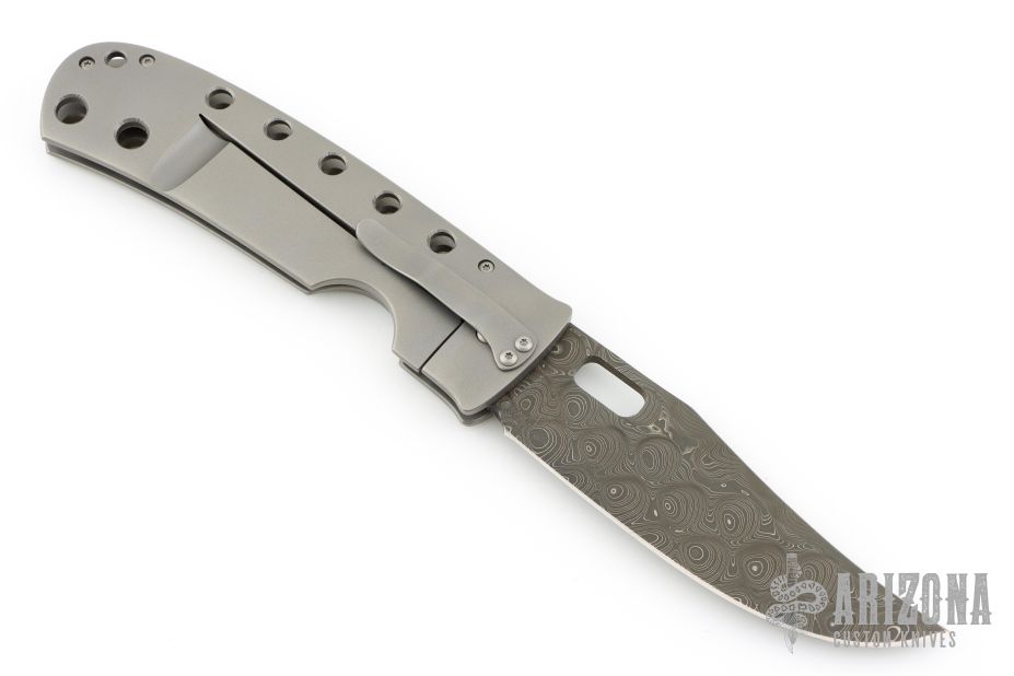 This Moran Bowie folder by Tom Mayo features a Damascus blade with a false top edge, thumbhole. The handle has a drilled and bead blasted titanium frame with matching tip down clip. Nice detent, lockup and blade seating. Comes with Bill's velcro case. Excellent condition.