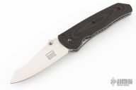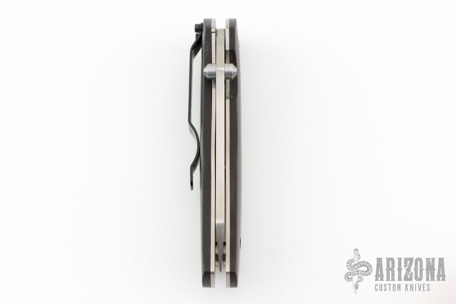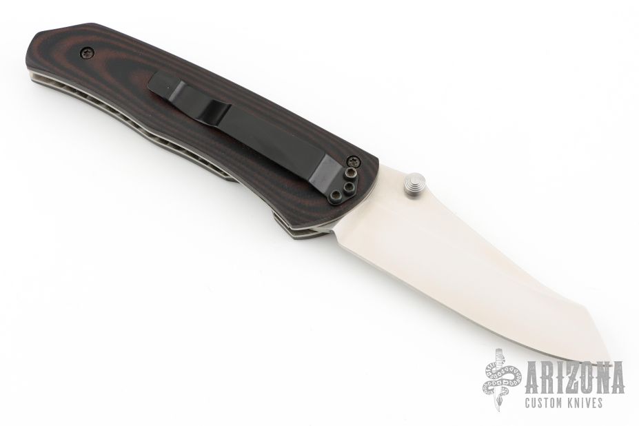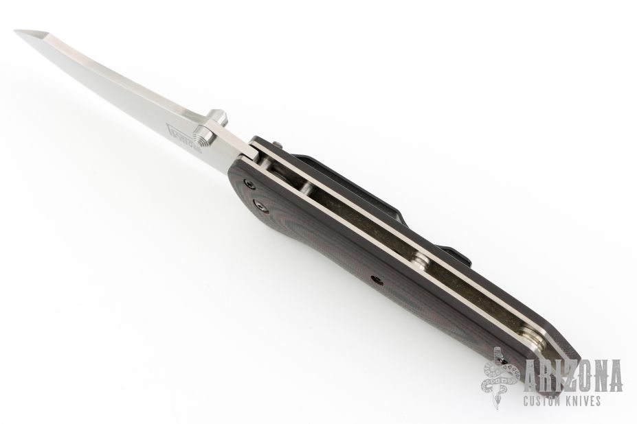 This knife by Joe and Mel Pardue features a satin finished blade with dual thumbstuds. The handle has black/red G-10 scales, satin finished titanium liners, tip down black stainless steel clip. Nice detent, lockup and blade seating. Excellent condition. Comes with a zippered case.