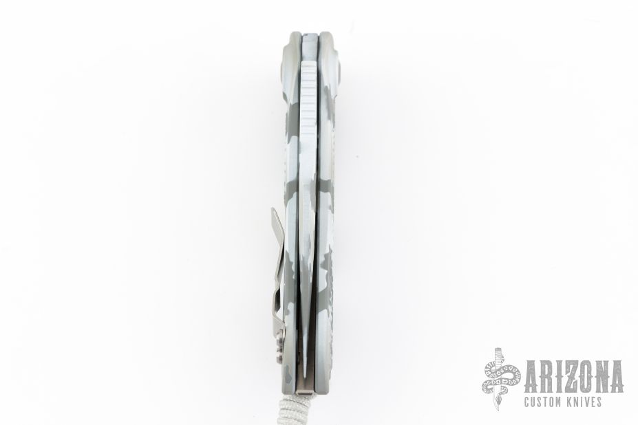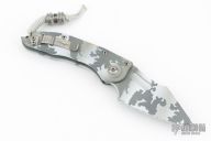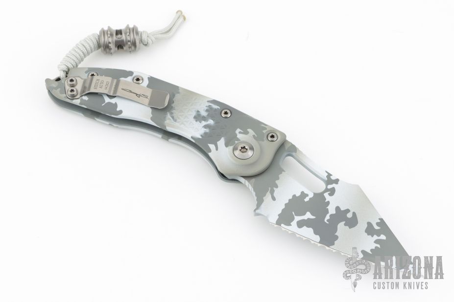This Stitch Auto by Microtech Knives features an artic camo finished fully serrated blade and false top edge, notched thumb and finger rests. The handle has an artic camo milled aluminum handle with a titanium backspacer and a stainless steel clip, tip up carry, lanyard hole at the butt. Dated 04/2023. Includes the original box and papers.  Excellent condition.