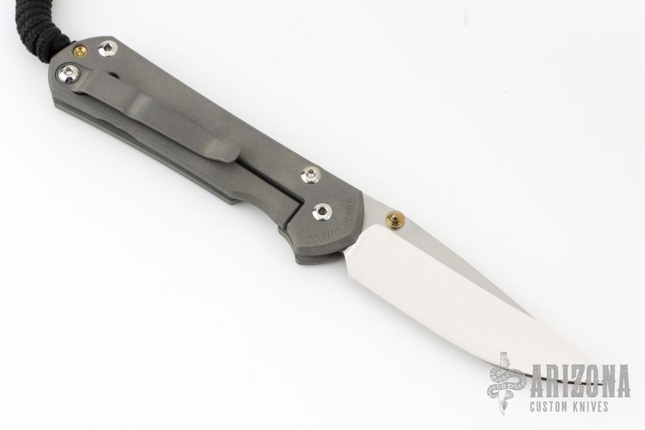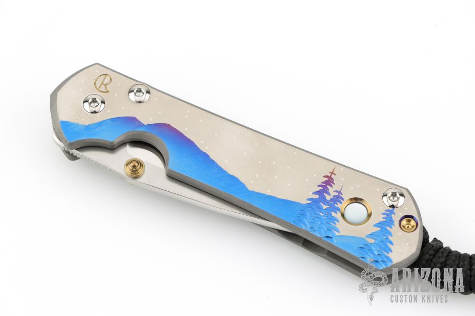 This Small Sebenza 31 from Chris Reeve Knives features a satin Magnacut blade with tumble finish flats and a "Night Sky" milled and anodized titanium frame with Mother of Pearl Cabochon and lanyard in pommel. Includes original box, leather sheath and paperwork dated May 28, 2025. Excellent Condition.
