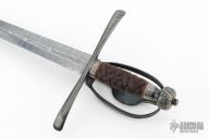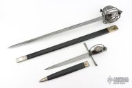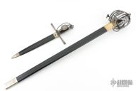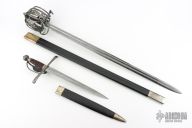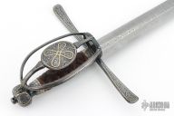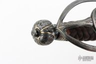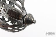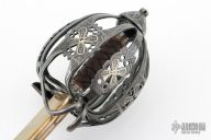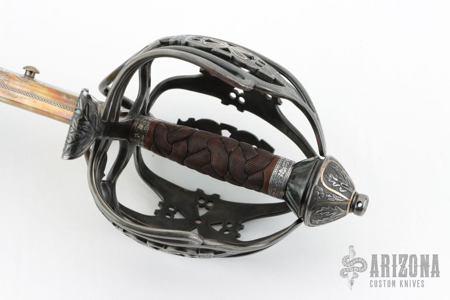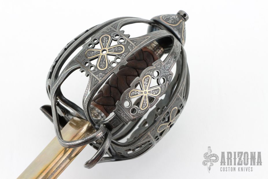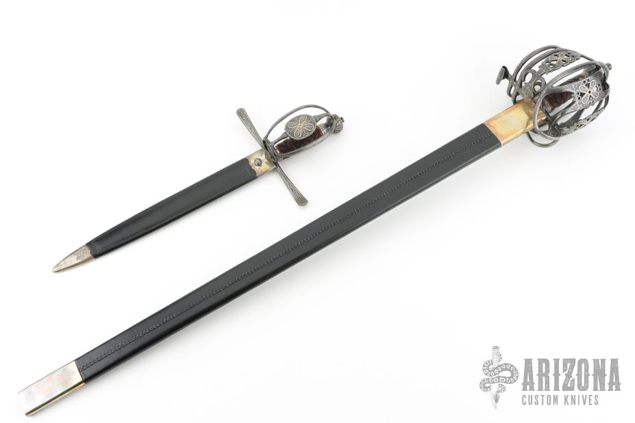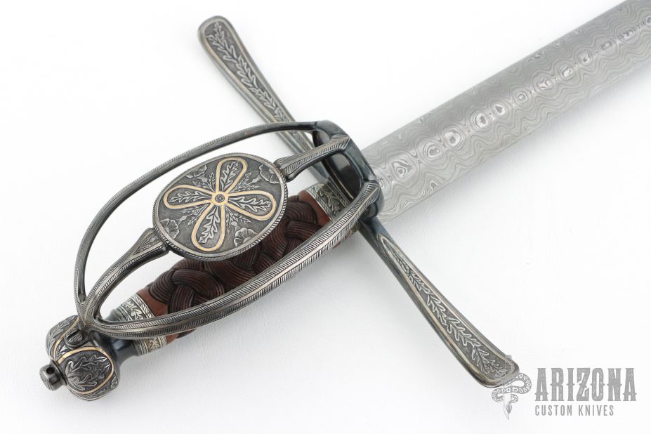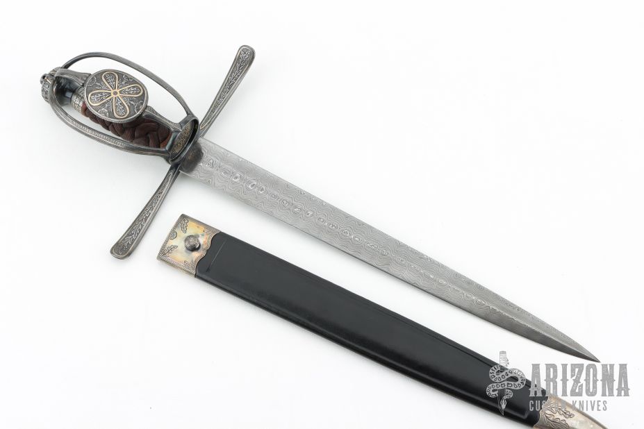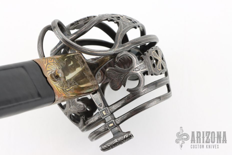 This Scottish Basket Hilt Sword from Vince Evans features a Damascus blade with fuller, gold inlaid maker's mark, .269" blade stock, 1.471" blade depth, hidden tang construction. The handle is comprised of a very intricate and stunning engraved basket hilt, and carved walnut grip. There are beautiful gold and silver inlays throughout, floral engraved collars, and engraved pommel with gold inlays. The listing includes a traditional wood/leather scabbard that has been engraved by the maker. Comes in a Maxpedition zippered nylon case (large). Excellent condition. Truly a masterpiece!