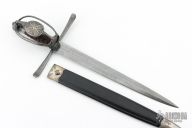 This Scottish Dagger from Vince Evans features a Damascus (Ladder pattern) dagger blade with .204" blade stock, 1.335" blade depth, hidden tang construction. The handle is comprised of an inlaid and engraved hilt, carved walnut grip. There are beautiful gold inlays, engraved collars, and pommel. The listing includes a traditional wood/leather scabbard that has been engraved by the maker. Comes with original purchase receipt from 2018 and card. Excellent condition. Truly a masterpiece! 20.4oz 13.5" Blade length, 19" overall. Hidden tang/ Has sheath.