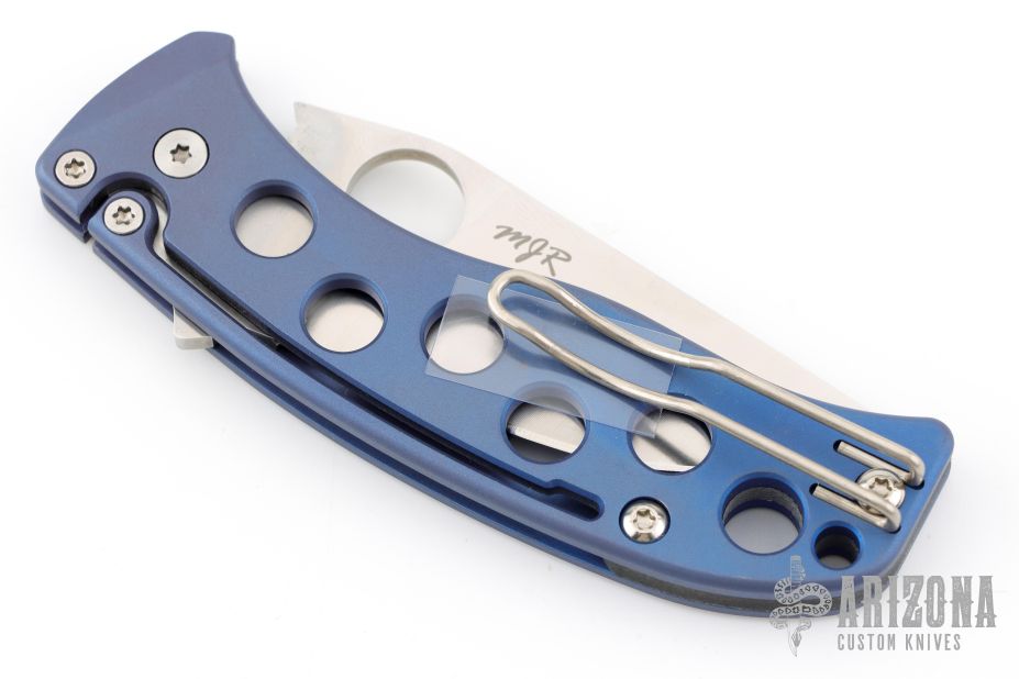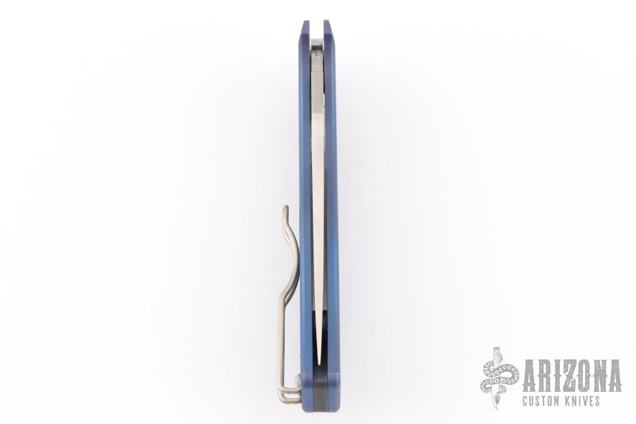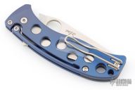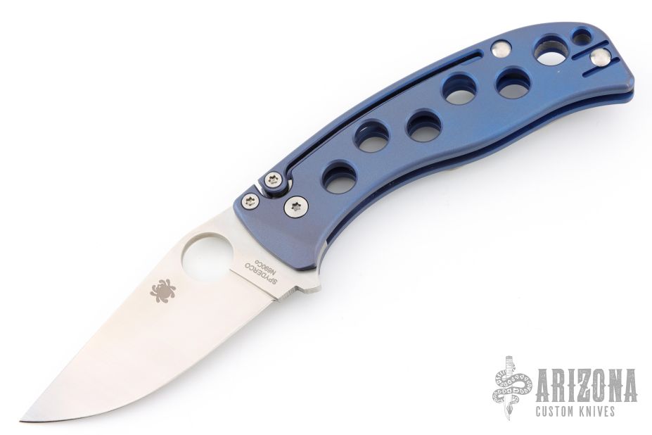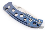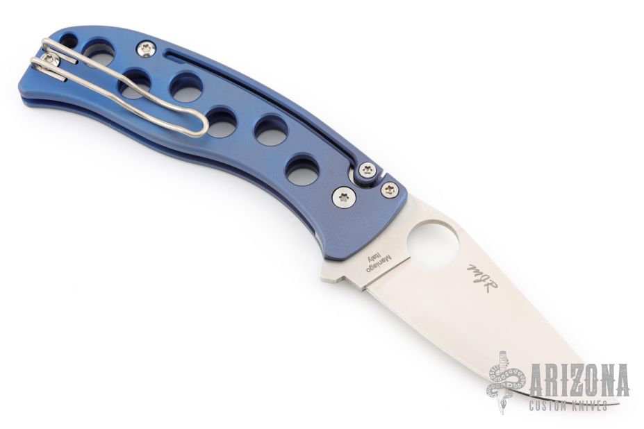 The PITS (Pie in the Sky) Folder is based on Mike Read's popular non-locking folder, which has been designed to comply with British knife laws. It has a full-flat ground N690Co steel clip point blade and precision-machined blue skeletonized titanium handle that aids in providing texture for grip. In addition, the handle features integral split spring arms to form the knife's unique slip-joint mechanism. Mike Read designed this knife to be a tough, hard-use folder and the combination of the lower blade guard with the integral spring act to prevent unintended closure. The PITS Folder includes Spyderco's deep carry wire clip for reversible tip-up carry.